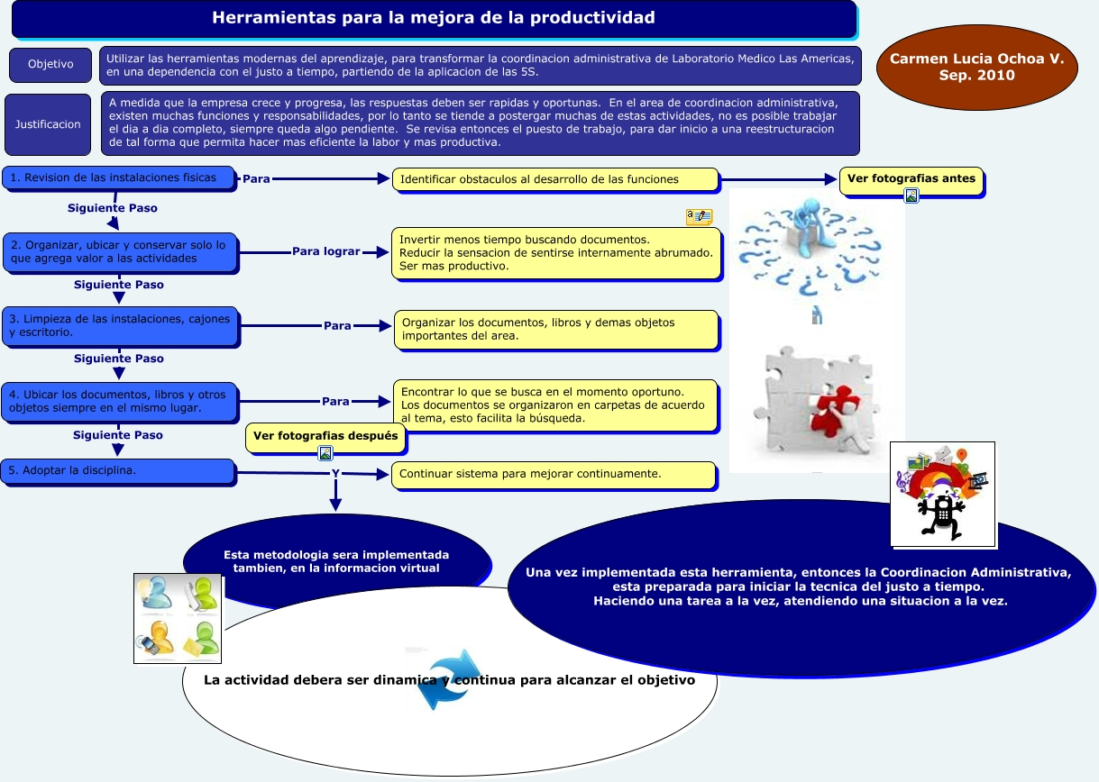 Este Cmap, tiene información relacionada con: ActividadNo.3HerramientasMejoraProductividad, Identificar obstaculos al desarrollo de las funciones ???? Ver fotografias antes, 1. Revision de las instalaciones fisicas Siguiente Paso 2. Organizar, ubicar y conservar solo lo que agrega valor a las actividades, 4. Ubicar los documentos, libros y otros objetos siempre en el mismo lugar. Siguiente Paso 5. Adoptar la disciplina., 2. Organizar, ubicar y conservar solo lo que agrega valor a las actividades Siguiente Paso 3. Limpieza de las instalaciones, cajones y escritorio., 3. Limpieza de las instalaciones, cajones y escritorio. Para Organizar los documentos, libros y demas objetos importantes del area., 5. Adoptar la disciplina. Y Esta metodologia sera implementada tambien, en la informacion virtual, 1. Revision de las instalaciones fisicas Para Identificar obstaculos al desarrollo de las funciones, 2. Organizar, ubicar y conservar solo lo que agrega valor a las actividades Para lograr Invertir menos tiempo buscando documentos. Reducir la sensacion de sentirse internamente abrumado. Ser mas productivo., 4. Ubicar los documentos, libros y otros objetos siempre en el mismo lugar. Para Encontrar lo que se busca en el momento oportuno. Los documentos se organizaron en carpetas de acuerdo al tema, esto facilita la búsqueda., 3. Limpieza de las instalaciones, cajones y escritorio. Siguiente Paso 4. Ubicar los documentos, libros y otros objetos siempre en el mismo lugar., 5. Adoptar la disciplina. Y Continuar sistema para mejorar continuamente.