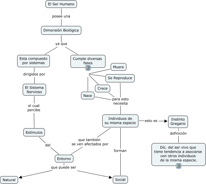Este Cmap, tiene información relacionada con: bio, Instinto Gregario definición Díc. del ser vivo que tiene tendencia a asociarse con otros individuos de la misma especie., Individuos de su misma especie esto es Instinto Gregario, Cumple diversas fases Muere, Esta compuesto por sistemas dirigidos por El Sistema Nervioso, Cumple diversas fases Se Reproduce, Entorno que también se ven afectados por Individuos de su misma especie, Dimensión Biológica ya que Cumple diversas fases, Cumple diversas fases Crece, Entorno del Estímulos, Individuos de su misma especie forman Social, Dimensión Biológica ya que Esta compuesto por sistemas, El Ser Humano posee una Dimensión Biológica, Entorno que puede ser Social, Cumple diversas fases Nace, Entorno que puede ser Natural, Se Reproduce para esto necesita Individuos de su misma especie, Se Reproduce para esto necesita Nace, Se Reproduce para esto necesita Crece, El Sistema Nervioso el cual percibe Estímulos