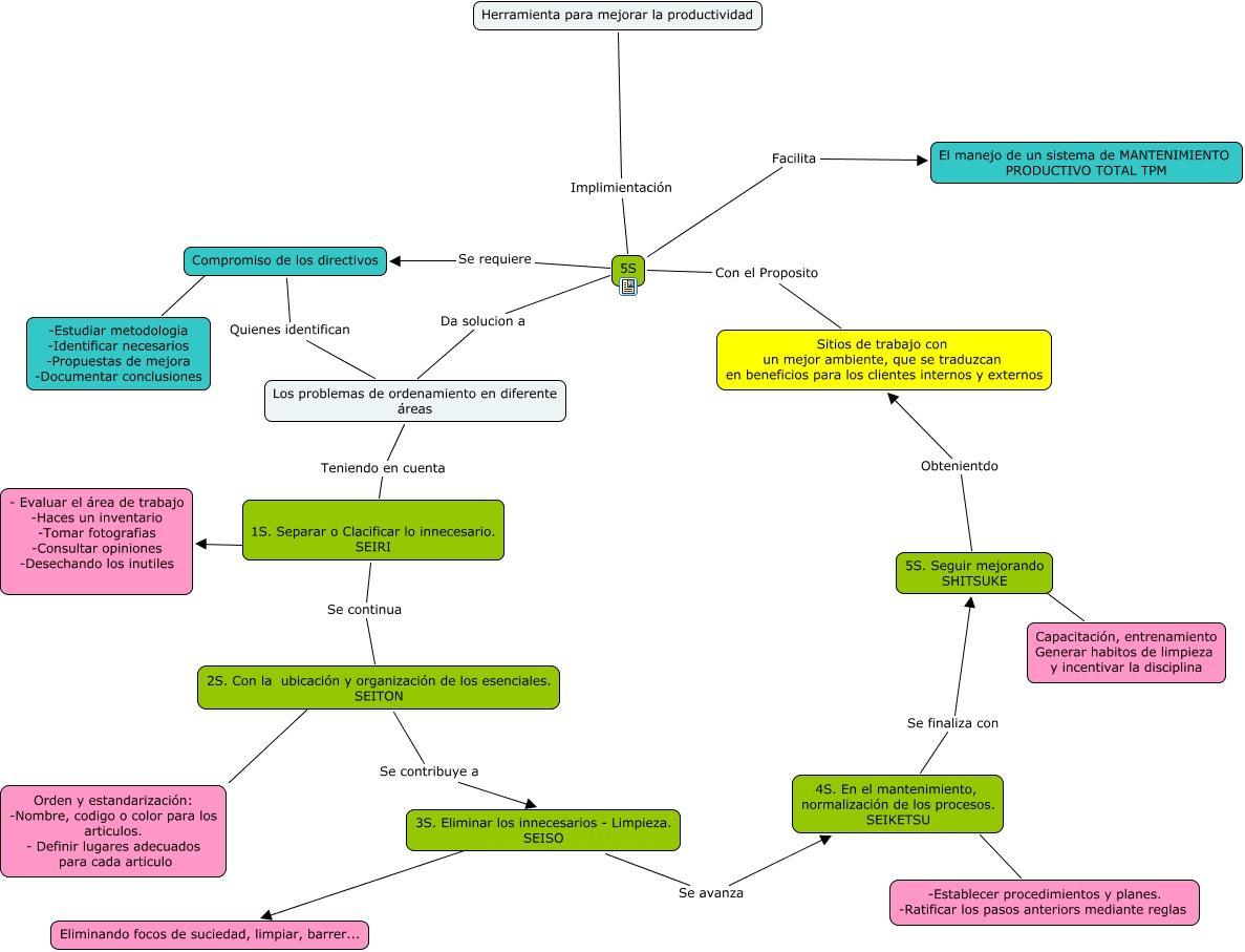 Este Cmap, tiene información relacionada con: Taller 2. Herramienta para mejorar productividad, 5S Facilita El manejo de un sistema de MANTENIMIENTO PRODUCTIVO TOTAL TPM, 4S. En el mantenimiento, normalización de los procesos. SEIKETSU Se finaliza con 5S. Seguir mejorando SHITSUKE, 2S. Con la ubicación y organización de los esenciales. SEITON Se contribuye a 3S. Eliminar los innecesarios - Limpieza. SEISO, 1S. Separar o Clacificar lo innecesario. SEIRI Se continua 2S. Con la ubicación y organización de los esenciales. SEITON, Los problemas de ordenamiento en diferente áreas Teniendo en cuenta 1S. Separar o Clacificar lo innecesario. SEIRI, 4S. En el mantenimiento, normalización de los procesos. SEIKETSU ???? -Establecer procedimientos y planes. -Ratificar los pasos anteriors mediante reglas, 2S. Con la ubicación y organización de los esenciales. SEITON ???? Orden y estandarización: -Nombre, codigo o color para los articulos. - Definir lugares adecuados para cada articulo, 5S. Seguir mejorando SHITSUKE ???? Capacitación, entrenamiento Generar habitos de limpieza y incentivar la disciplina, 5S Con el Proposito Sitios de trabajo con un mejor ambiente, que se traduzcan en beneficios para los clientes internos y externos, 5S Se requiere Compromiso de los directivos, 1S. Separar o Clacificar lo innecesario. SEIRI - Evaluar el área de trabajo -Haces un inventario -Tomar fotografias -Consultar opiniones -Desechando los inutiles, Compromiso de los directivos Quienes identifican Los problemas de ordenamiento en diferente áreas, 5S. Seguir mejorando SHITSUKE Obtenientdo Sitios de trabajo con un mejor ambiente, que se traduzcan en beneficios para los clientes internos y externos, 5S Da solucion a Los problemas de ordenamiento en diferente áreas, 3S. Eliminar los innecesarios - Limpieza. SEISO Se avanza 4S. En el mantenimiento, normalización de los procesos. SEIKETSU, Compromiso de los directivos ???? -Estudiar metodologia -Identificar necesarios -Propuestas de mejora -Documentar conclusiones, 3S. Eliminar los innecesarios - Limpieza. SEISO ???? Eliminando focos de suciedad, limpiar, barrer..., Herramienta para mejorar la productividad Implimientación 5S