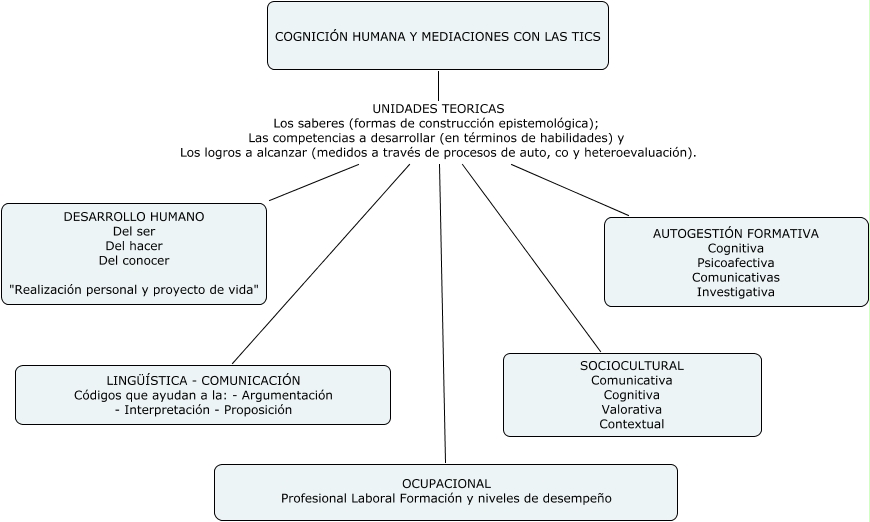 Este Cmap, tiene información relacionada con: cognición humanda y mediacion con las tics - Zilia Brid - Ligia Cristina Rodriguez, COGNICIÓN HUMANA Y MEDIACIONES CON LAS TICS UNIDADES TEORICAS Los saberes (formas de construcción epistemológica); Las competencias a desarrollar (en términos de habilidades) y Los logros a alcanzar (medidos a través de procesos de auto, co y heteroevaluación). AUTOGESTIÓN FORMATIVA Cognitiva Psicoafectiva Comunicativas Investigativa, COGNICIÓN HUMANA Y MEDIACIONES CON LAS TICS UNIDADES TEORICAS Los saberes (formas de construcción epistemológica); Las competencias a desarrollar (en términos de habilidades) y Los logros a alcanzar (medidos a través de procesos de auto, co y heteroevaluación). SOCIOCULTURAL Comunicativa Cognitiva Valorativa Contextual, COGNICIÓN HUMANA Y MEDIACIONES CON LAS TICS UNIDADES TEORICAS Los saberes (formas de construcción epistemológica); Las competencias a desarrollar (en términos de habilidades) y Los logros a alcanzar (medidos a través de procesos de auto, co y heteroevaluación). LINGÜÍSTICA - COMUNICACIÓN Códigos que ayudan a la: - Argumentación - Interpretación - Proposición, COGNICIÓN HUMANA Y MEDIACIONES CON LAS TICS UNIDADES TEORICAS Los saberes (formas de construcción epistemológica); Las competencias a desarrollar (en términos de habilidades) y Los logros a alcanzar (medidos a través de procesos de auto, co y heteroevaluación). OCUPACIONAL Profesional Laboral Formación y niveles de desempeño, COGNICIÓN HUMANA Y MEDIACIONES CON LAS TICS UNIDADES TEORICAS Los saberes (formas de construcción epistemológica); Las competencias a desarrollar (en términos de habilidades) y Los logros a alcanzar (medidos a través de procesos de auto, co y heteroevaluación). DESARROLLO HUMANO Del ser Del hacer Del conocer "Realización personal y proyecto de vida"