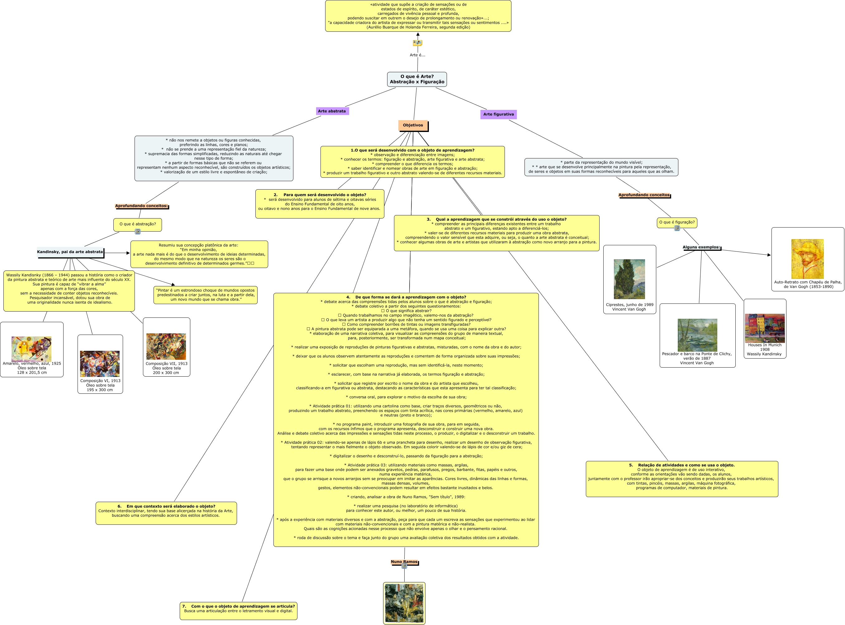 Esse mapa conceitual, produzido no IHMC CmapTools, tem a informação relacionada a: Objeto de aprendizagem, O que é Arte? Abstração x Figuração Objetivos 4. De que forma se dará a aprendizagem com o objeto? * debate acerca das compreensões tidas pelos alunos sobre o que é abstração e figuração; * debate coletivo a partir dos seguintes questionamentos: O que significa abstrair? Quando trabalhamos no campo imagético, valemo-nos da abstração? O que leva um artista a produzir algo que não tenha um sentido figurado e perceptível? Como compreender borrões de tintas ou imagens transfiguradas? A pintura abstrata pode ser equiparada a uma metáfora, quando se usa uma coisa para explicar outra? * elaboração de uma narrativa coletiva, para visualizar as compreensões do grupo de maneira textual, para, posteriormente, ser transformada num mapa conceitual; * realizar uma exposição de reproduções de pinturas figurativas e abstratas, misturadas, com o nome da obra e do autor; * deixar que os alunos observem atentamente as reproduções e comentem de forma organizada sobre suas impressões; * solicitar que escolham uma reprodução, mas sem identificá-la, neste momento; * esclarecer, com base na narrativa já elaborada, os termos figuração e abstração; * solicitar que registre por escrito o nome da obra e do artista que escolheu, classificando-a em figurativa ou abstrata, destacando as características que esta apresenta para ter tal classificação; * conversa oral, para explorar o motivo da escolha de sua obra; * Atividade prática 01: utilizando uma cartolina como base, criar traços diversos, geométricos ou não, produzindo um trabalho abstrato, preenchendo os espaços com tinta acrílica, nas cores primárias (vermelho, amarelo, azul) e neutras (preto e branco); * no programa paint, introduzir uma fotografia de sua obra, para em seguida, com os recursos ínfimos que o programa apresenta, desconstruir e construir uma nova obra. Análise e debate coletivo acerca das impressões e sensações tidas neste processo, o produzir, o digitalizar e o desconstruir um trabalho. * Atividade prática 02: valendo-se apenas de lápis 6b e uma prancheta para desenho, realizar um desenho de observação figurativa, tentando representar o mais fielmente o objeto observado. Em seguida colorir valendo-se de lápis de cor e/ou giz de cera; * digitalizar o desenho e desconstruí-lo, passando da figuração para a abstração; * Atividade prática 03: utilizando materiais como massas, argilas, para fazer uma base onde podem ser anexados gravetos, pedras, parafusos, pregos, barbante, fitas, papéis e outros, numa experiência matérica, que o grupo se arrisque a novos arranjos sem se preocupar em imitar as aparências. Cores livres, dinâmicas das linhas e formas, massas densas, volumes, gestos, elementos não-convencionais podem resultar em efeitos bastante inusitados e belos. * criando, analisar a obra de Nuno Ramos, "Sem título", 1989: * realizar uma pesquisa (no laboratório de informática) para conhecer este autor, ou melhor, um pouco de sua história. * após a experiência com materiais diversos e com a abstração, peça para que cada um escreva as sensações que experimentou ao lidar com materiais não-convencionais e com a pintura matérica e não-realista. Quais são as cognições acionadas nesse processo que não envolve apenas o olhar e o pensamento racional. * roda de discussão sobre o tema e faça junto do grupo uma avaliação coletiva dos resultados obtidos com a atividade., O que é Arte? Abstração x Figuração Objetivos 7. Com o que o objeto de aprendizagem se articula? Busca uma articulação entre o letramento visual e digital., O que é Arte? Abstração x Figuração Arte abstrata * não nos remete a objetos ou figuras conhecidas, preferindo as linhas, cores e planos; * não se prende a uma representação fiel da natureza; * supremacia das formas simplificadas, reduzindo as naturais até chegar nesse tipo de forma; * a partir de formas básicas que não se referem ou representam nenhum aspecto reconhecível, são construídos os objetos artísticos; * valorização de um estilo livre e espontâneo de criação;, O que é abstração? Kandinsky, pai da arte abstrata “Pintar é um estrondoso choque de mundos opostos predestinados a criar juntos, na luta e a partir dela, um novo mundo que se chama obra.”, O que é Arte? Abstração x Figuração Objetivos 3. Qual a aprendizagem que se constrói através do uso o objeto? * compreender as principais diferenças existentes entre um trabalho abstrato e um figurativo, estando apto a diferenciá-los; * valer-se de diferentes recursos materiais para produzir uma obra abstrata, compreendendo o valor sensível que esta adquire, ou seja, o quanto a arte abstrata é conceitual; * conhecer algumas obras de arte e artistas que utilizaram à abstração como novo arranjo para a pintura., O que é Arte? Abstração x Figuração Arte figurativa * parte da representação do mundo visível; * * arte que se desenvolve principalmente na pintura pela representação, de seres e objetos em suas formas reconhecíveis para aqueles que as olham., O que é abstração? Kandinsky, pai da arte abstrata Wassily Kandisnky (1866 – 1944) passou a história como o criador da pintura abstrata e teórico de arte mais influente do século XX. Sua pintura é capaz de “vibrar a alma” apenas com a força das cores, sem a necessidade de conter objetos reconhecíveis. Pesquisador incansável, dotou sua obra de uma originalidade nunca isenta de idealismo., O que é abstração? Kandinsky, pai da arte abstrata Composição VII, 1913 Óleo sobre tela 200 x 300 cm, O que é figuração? Alguns exemplos: Ciprestes, junho de 1989 Vincent Van Gogh, O que é Arte? Abstração x Figuração Arte é... «atividade que supõe a criação de sensações ou de estados de espírito, de caráter estético, carregados de vivência pessoal e profunda, podendo