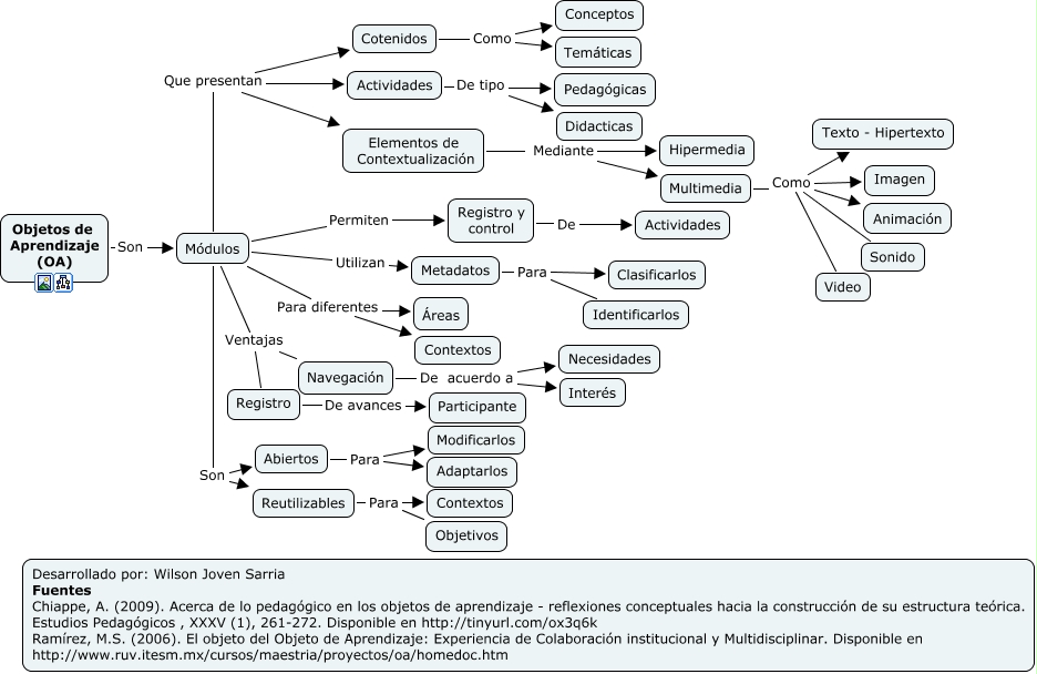 Este Cmap, tiene información relacionada con: 0.ObjetosAprendizaje, Módulos Son Abiertos, Objetos de Aprendizaje (OA) Son Módulos, Módulos Que presentan Actividades, Actividades De tipo Pedagógicas, Navegación De acuerdo a Necesidades, Metadatos Para Identificarlos, Multimedia Como Texto - Hipertexto, Multimedia Como Imagen, Cotenidos Como Conceptos, Multimedia Como Sonido, Elementos de Contextualización Mediante Hipermedia, Reutilizables Para Objetivos, Multimedia Como Animación, Navegación De acuerdo a Interés, Abiertos Para Modificarlos, Reutilizables Para Contextos, Módulos Son Reutilizables, Módulos Ventajas Registro, Módulos Para diferentes Contextos, Multimedia Como Video