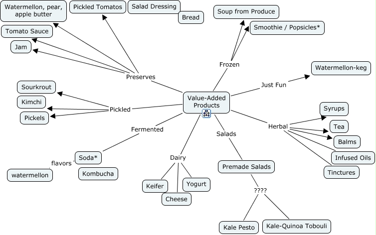This Concept Map, created with IHMC CmapTools, has information related to: Value-Added Products, Value-Added Products Salads Premade Salads, Value-Added Products Preserves Watermellon, pear, apple butter, Value-Added Products Frozen Smoothie / Popsicles*, Value-Added Products Herbal Tea, Value-Added Products Herbal Syrups, Soda* flavors watermellon, Premade Salads ???? Kale Pesto, Value-Added Products Dairy Yogurt, Value-Added Products Just Fun Watermellon-keg, Value-Added Products Frozen Soup from Produce, Value-Added Products Preserves Jam, Value-Added Products Dairy Keifer, Value-Added Products Herbal Infused Oils, Value-Added Products Herbal Balms, Value-Added Products Fermented Soda*, Value-Added Products Herbal Tinctures, Value-Added Products Preserves Tomato Sauce, Value-Added Products Pickled Sourkrout, Value-Added Products Pickled Kimchi, Value-Added Products Dairy Cheese