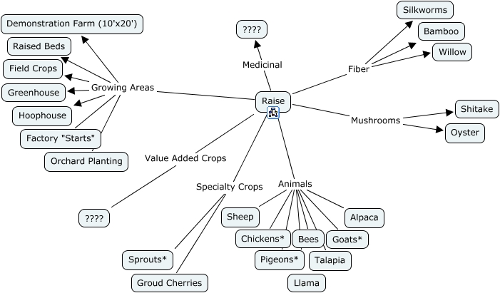 This Concept Map, created with IHMC CmapTools, has information related to: Raise, Raise Animals Pigeons*, Raise Animals Sheep, Raise Value Added Crops ????, Raise Specialty Crops Sprouts*, Raise Growing Areas Demonstration Farm (10'x20'), Raise Animals Bees, Raise Growing Areas Raised Beds, Raise Growing Areas Factory "Starts", Raise Animals Talapia, Raise Medicinal ????, Raise Animals Alpaca, Raise Fiber Silkworms, Raise Growing Areas Greenhouse, Raise Fiber Willow, Raise Animals Pigeons*, Raise Specialty Crops Groud Cherries, Raise Growing Areas Hoophouse, Raise Growing Areas Field Crops, Raise Fiber Bamboo, Raise Growing Areas Orchard Planting