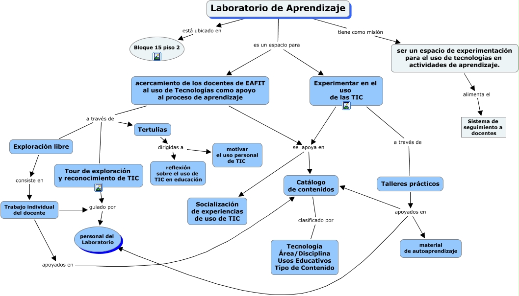 Este Cmap, tiene información relacionada con: LAB Aprendizaje, Laboratorio de Aprendizaje es un espacio para acercamiento de los docentes de EAFIT al uso de Tecnologías como apoyo al proceso de aprendizaje, Experimentar en el uso de las TIC se apoya en Catálogo de contenidos, Laboratorio de Aprendizaje tiene como misión ser un espacio de experimentación para el uso de tecnologías en actividades de aprendizaje., Tertulias dirigidas a motivar el uso personal de TIC, Catálogo de contenidos clasificado por Tecnología Área/Disciplina Usos Educativos Tipo de Contenido, acercamiento de los docentes de EAFIT al uso de Tecnologías como apoyo al proceso de aprendizaje a través de Tertulias, Talleres prácticos apoyados en material de autoaprendizaje, acercamiento de los docentes de EAFIT al uso de Tecnologías como apoyo al proceso de aprendizaje se apoya en Catálogo de contenidos, ser un espacio de experimentación para el uso de tecnologías en actividades de aprendizaje. alimenta el Sistema de seguimiento a docentes, Tour de exploración y reconocimiento de TIC guiado por personal del Laboratorio, Tertulias dirigidas a reflexión sobre el uso de TIC en educación, Laboratorio de Aprendizaje está ubicado en Bloque 15 piso 2, acercamiento de los docentes de EAFIT al uso de Tecnologías como apoyo al proceso de aprendizaje a través de Tour de exploración y reconocimiento de TIC, Trabajo individual del docente apoyados en Catálogo de contenidos, acercamiento de los docentes de EAFIT al uso de Tecnologías como apoyo al proceso de aprendizaje se apoya en Socialización de experiencias de uso de TIC, Talleres prácticos apoyados en Catálogo de contenidos, Talleres prácticos apoyados en personal del Laboratorio, acercamiento de los docentes de EAFIT al uso de Tecnologías como apoyo al proceso de aprendizaje a través de Exploración libre, Experimentar en el uso de las TIC se apoya en Socialización de experiencias de uso de TIC, Exploración libre consiste en Trabajo individual del docente