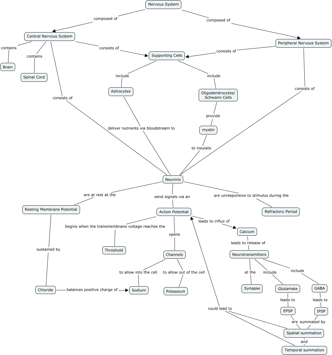 This Concept Map, created with IHMC CmapTools, has information related to: Chapter 11-Nervous System, Astrocytes deliver nutrients via bloodstream to Neurons, Neurons are at rest at the Resting Membrane Potential, Central Nervous System contains Brain, myelin to insulate Neurons, Central Nervous System consists of Neurons, Glutamate leads to EPSP, Central Nervous System consists of Supporting Cells, Channels to allow out of the cell Potassium, EPSP are Spatial summation, IPSP summated by Spatial summation, Nervous System composed of Central Nervous System, GABA leads to IPSP, Supporting Cells include Oligodendrocytes/ Schwann Cells, Neurotransmitters include Glutamate, Supporting Cells include Astrocytes, Peripheral Nervous System consists of Supporting Cells, Spatial summation could lead to Action Potential, Central Nervous System contains Spinal Cord, Neurotransmitters include GABA, Neurotransmitters at the Synapse