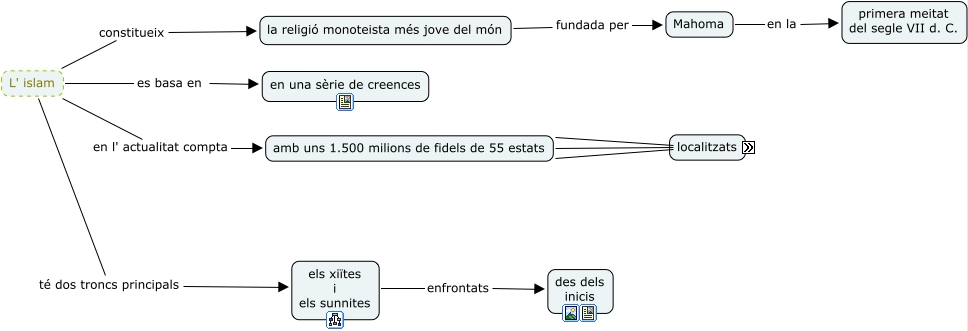 Aquest mapa conceptual conté informació relacionada amb: L' Islam, amb uns 1.500 milions de fidels de 55 estats repartits per arreu i fonamentalment en un arc geogràfic que va de Mauritània a Indonèsia, Mahoma en la primera meitat del segle VII d. C., els xiïtes i els sunnites enfrontats des dels inicis, només 22 estats, uns 300 milions, són àrabs reunits en la Lliga Àrab, amb uns 1.500 milions de fidels de 55 estats agrupats en l' Organització de la Conferència Islàmica, L' islam en l' actualitat compta amb uns 1.500 milions de fidels de 55 estats, L' islam té dos troncs principals els xiïtes i els sunnites, L' islam constitueix la religió monoteista més jove del món, la religió monoteista més jove del món fundada per Mahoma, amb uns 1.500 milions de fidels de 55 estats d' aquests només 22 estats, uns 300 milions, són àrabs, L' islam es basa en en una sèrie de creences