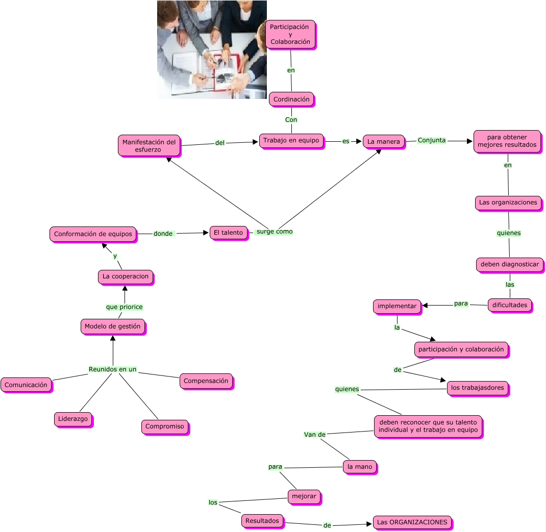 Este Cmap, tiene información relacionada con: TRABAJO fINAL, La cooperacion y Conformación de equipos, Manifestación del esfuerzo del Trabajo en equipo, Resultados de Las ORGANIZACIONES, Cordinación Con Trabajo en equipo, Compromiso Reunidos en un Modelo de gestión, Modelo de gestión que priorice La cooperacion, Las organizaciones quienes deben diagnosticar, para obtener mejores resultados en Las organizaciones, Conformación de equipos donde El talento, participación y colaboración de los trabajasdores, Liderazgo Reunidos en un Modelo de gestión, El talento surge como Manifestación del esfuerzo, deben reconocer que su talento individual y el trabajo en equipo Van de la mano, dificultades para implementar, Participación y Colaboración en Cordinación, La manera Conjunta para obtener mejores resultados, implementar la participación y colaboración, Compensación Reunidos en un Modelo de gestión, la mano para mejorar, La manera Conjunta para obtener mejores resultados