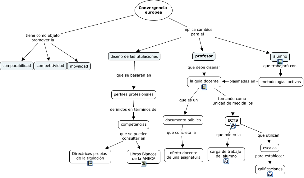 Este Cmap, tiene información relacionada con: BEA, diseño de las titulaciones que se basarán en perfiles profesionales, la guía docente que es un documento público, competencias que se pueden consultar en Libros Blancos de la ANECA, Convergencia europea implica cambios para el alumno, Convergencia europea tiene como objeto promover la comparabilidad, Convergencia europea tiene como objeto promover la competitividad, ECTS que utilizan escalas, metodologías activas plasmadas en la guía docente, Convergencia europea tiene como objeto promover la movilidad, perfiles profesionales definidos en términos de competencias, alumno que trabajará con metodologías activas, profesor que debe diseñar la guía docente, ECTS que miden la carga de trabajo del alumno, documento público que concreta la oferta docente de una asignatura, competencias que se pueden consultar en Directrices propias de la titulación, Convergencia europea implica cambios para el diseño de las titulaciones, escalas para establecer calificaciones, Convergencia europea implica cambios para el profesor, la guía docente tomando como unidad de medida los ECTS