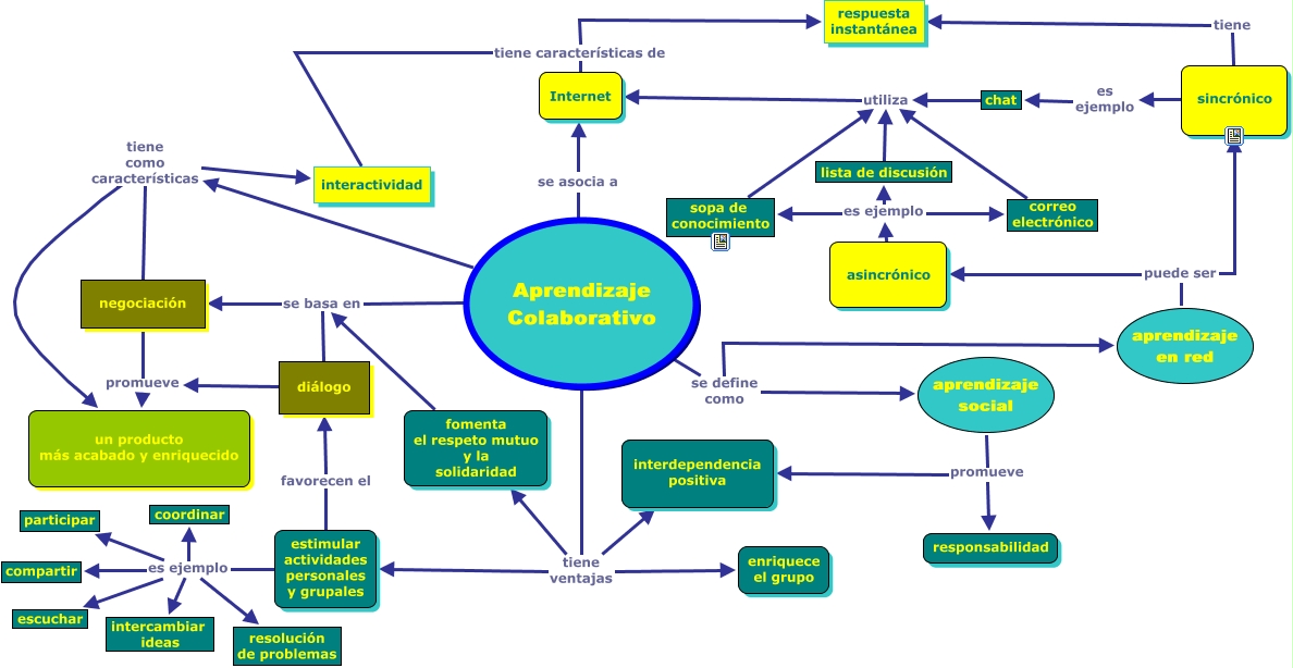 Este Cmap, tiene información relacionada con: Aprendizaje colaborativo, Aprendizaje Colaborativo tiene como características un producto más acabado y enriquecido, sincrónico es ejemplo chat, estimular actividades personales y grupales es ejemplo escuchar, fomenta el respeto mutuo y la solidaridad se basa en diálogo, estimular actividades personales y grupales es ejemplo coordinar, Aprendizaje Colaborativo tiene ventajas interdependencia positiva, aprendizaje en red puede ser sincrónico, Aprendizaje Colaborativo tiene como características interactividad, Aprendizaje Colaborativo se define como aprendizaje social, aprendizaje en red puede ser asincrónico, Internet tiene características de respuesta instantánea, estimular actividades personales y grupales es ejemplo participar, estimular actividades personales y grupales es ejemplo resolución de problemas, correo electrónico utiliza Internet, Aprendizaje Colaborativo tiene ventajas fomenta el respeto mutuo y la solidaridad, Aprendizaje Colaborativo tiene ventajas estimular actividades personales y grupales, lista de discusión utiliza Internet, Aprendizaje Colaborativo se basa en negociación, chat utiliza Internet, Aprendizaje Colaborativo se define como aprendizaje en red