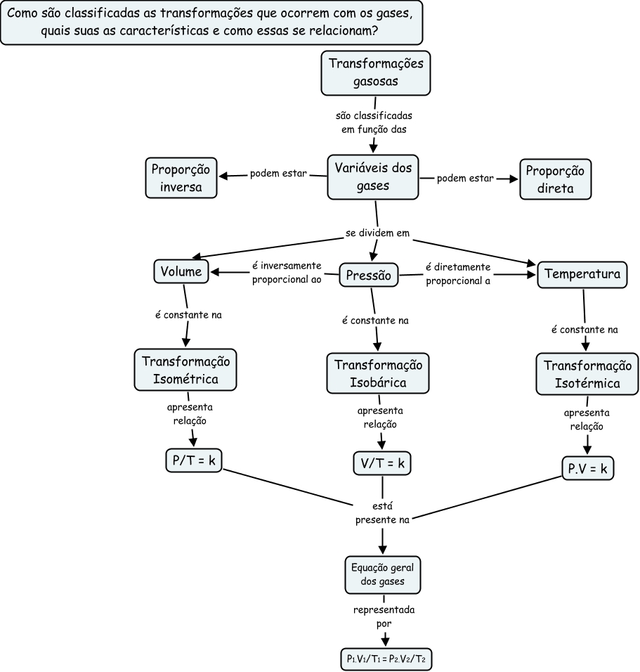 Esse mapa conceitual, produzido no IHMC CmapTools, tem a informação relacionada a: LEIS DOS GASES, Variáveis dos gases podem estar Proporção inversa, V/T = k está presente na Equação geral dos gases, P/T = k está presente na Equação geral dos gases, Volume é constante na Transformação Isométrica, Pressão é constante na Transformação Isobárica, Temperatura é constante na Transformação Isotérmica, Variáveis dos gases se dividem em Temperatura, Variáveis dos gases se dividem em Volume, Variáveis dos gases se dividem em Pressão, P.V = k está presente na Equação geral dos gases, Transformação Isobárica apresenta relação V/T = k, Transformação Isotérmica apresenta relação P.V = k, Pressão é diretamente proporcional a Temperatura, Variáveis dos gases podem estar Proporção direta, Equação geral dos gases representada por P1.V1/T1 = P2.V2/T2, Transformação Isométrica apresenta relação P/T = k, Pressão é inversamente proporcional ao Volume, Transformações gasosas são classificadas em função das Variáveis dos gases