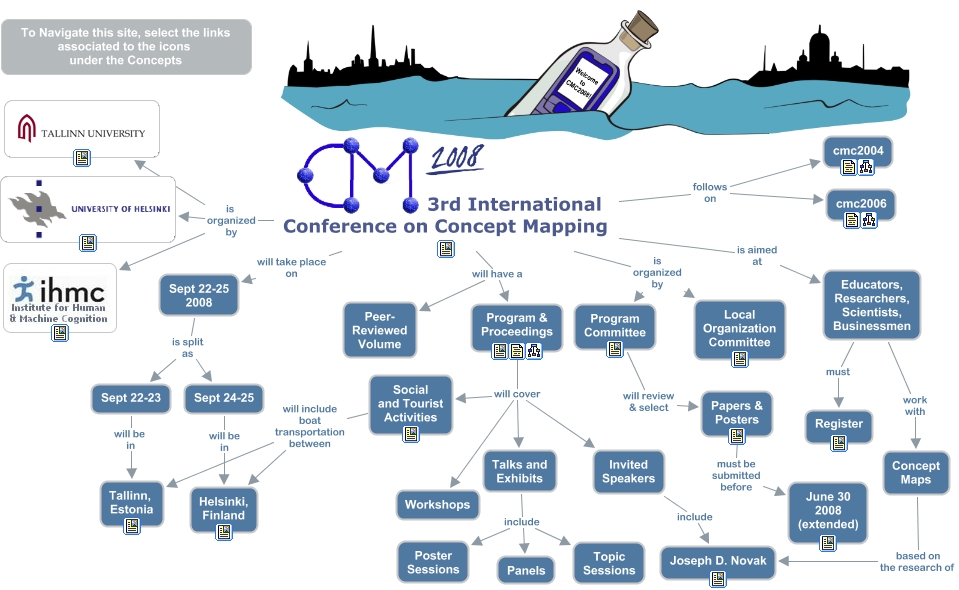 Este Cmap, tiene información relacionada con: 3rd Concept Mapping Conference, Talks and Exhibits include Topic Sessions, 3rd International Conference on Concept Mapping is organized by, Educators, Researchers, Scientists, Businessmen work with Concept Maps, Papers & Posters must be submitted before June 30 2008 (extended), Program & Proceedings will cover Talks and Exhibits, Program & Proceedings will cover Workshops, 3rd International Conference on Concept Mapping is organized by Local Organization Committee, 3rd International Conference on Concept Mapping will have a Program & Proceedings, Social and Tourist Activities will include boat transportation between Helsinki, Finland, Program & Proceedings will cover Social and Tourist Activities, Talks and Exhibits include Poster Sessions, Program & Proceedings will cover Invited Speakers, Sept 22-23 will be in Tallinn, Estonia, 3rd International Conference on Concept Mapping will have a Peer- Reviewed Volume, 3rd International Conference on Concept Mapping is organized by Program Committee, 3rd International Conference on Concept Mapping follows on cmc2004, Talks and Exhibits include Panels, 3rd International Conference on Concept Mapping follows on cmc2006, Social and Tourist Activities will include boat transportation between Tallinn, Estonia, Program Committee will review & select Papers & Posters