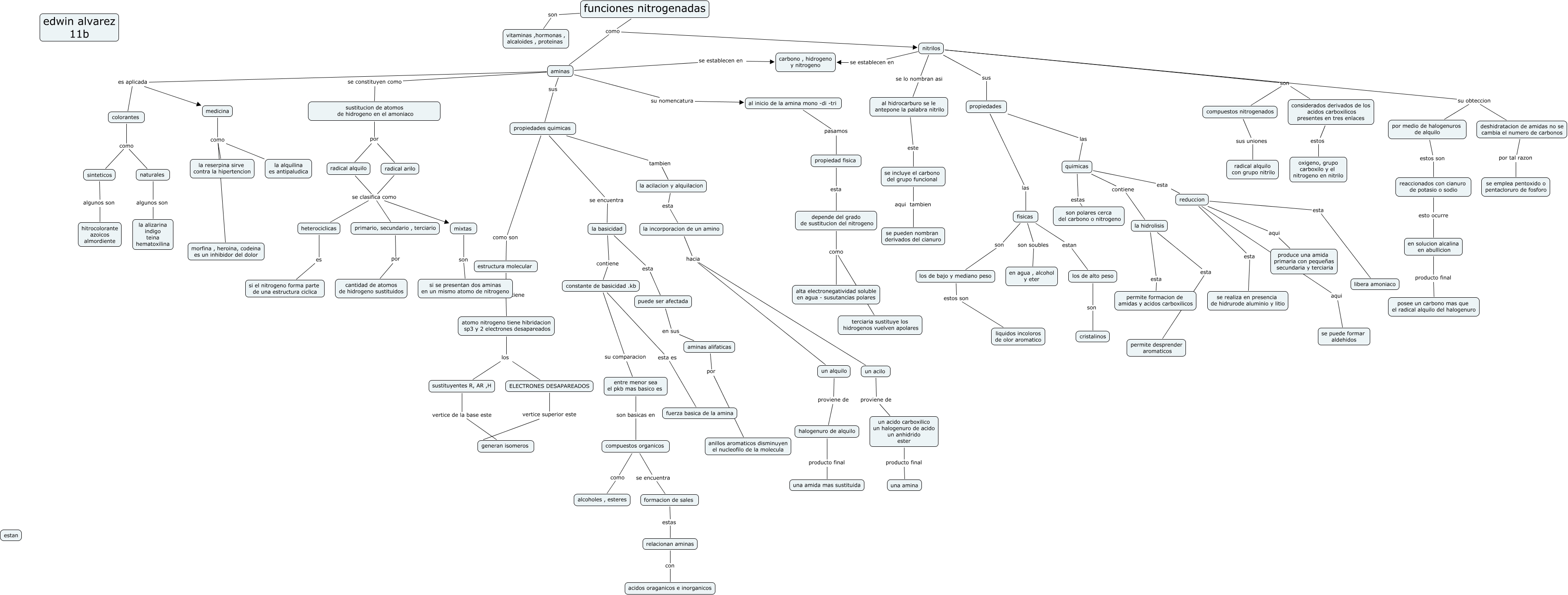 Este Cmap, tiene información relacionada con: funciones nitrogenadas, la basicidad contiene constante de basicidad .kb, radical alquilo se clasifica como mixtas, sinteticos algunos son hitrocolorante azoicos almordiente, los de alto peso son cristalinos, la hidrolisis esta permite desprender aromaticos, formacion de sales estas relacionan aminas, sustituyentes R, AR ,H vertice de la base este generan isomeros, atomo nitrogeno tiene hibridacion sp3 y 2 electrones desapareados los ELECTRONES DESAPAREADOS, fisicas son los de bajo y mediano peso, nitrilos se lo nombran asi al hidrocarburo se le antepone la palabra nitrilo, quimicas esta reduccion, colorantes como sinteticos, compuestos organicos se encuentra formacion de sales, reaccionados con cianuro de potasio o sodio esto ocurre en solucion alcalina en abullicion, por medio de halogenuros de alquilo estos son reaccionados con cianuro de potasio o sodio, aminas se establecen en carbono , hidrogeno y nitrogeno, funciones nitrogenadas como aminas, los de bajo y mediano peso estos son liquidos incoloros de olor aromatico, nitrilos se establecen en carbono , hidrogeno y nitrogeno, nitrilos son considerados derivados de los acidos carboxilicos presentes en tres enlaces