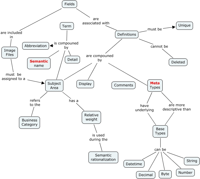 This Concept Map, created with IHMC CmapTools, has information related to: Expressor Meta Types, Definitions must be Unique, Subject Area refers to the Business Category, Image Files must be assigned to a Subject Area, Fields are associated with Definitions, Base Types can be Decimal, Definitions cannot be Deleted, Fields are included in Image Files, Base Types can be Datetime, Subject Area has a Relative weight, Term is compouned by Semantic name, Term is compouned by Subject Area, Definitions are compouned by Meta Types, Base Types can be Byte, Meta Types are more descriptive than Base Types, Term is compouned by Detail, Base Types can be String, Definitions are compouned by Subject Area, Term is compouned by Abbreviation, Relative weight is used during the Semantic rationalization, Base Types can be Number