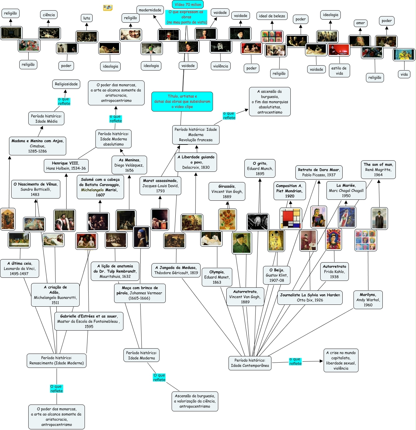 Esse mapa conceitual, produzido no IHMC CmapTools, tem a informação relacionada a: 70 milion, ???? ideologia, ???? Marilyns, Andy Warhol, 1960, ???? estilo de vida, ???? Henrique VIII, Hans Holbein, 1534-36, A Liberdade guiando o povo, Delacroix, 1830 ???? Período histórico: Idade Moderna Revolução francesa, ???? Autorretrato Frida Kahlo, 1938, ???? ideal de beleza, ???? Marat assassinado, Jacques-Louis David, 1793, Olympia, Eduard Manet, 1863 ???? ????, ???? poder, ???? A Liberdade guiando o povo, Delacroix, 1830, Gabrielle d’Estrées et as souer, Master da Escola de Fontainebleau , 1595 ???? Período histórico: Renascimento (Idade Moderna), Autorretrato Frida Kahlo, 1938 ???? ????, ???? violência, ???? religião, Período histórico: Idade Moderna Revolução francesa o que reflete A ascensão da burguesia, o fim das monarquias absolutistas, antrocentismo, ???? A criação de Adão, Michelangelo Buonarotti, 1511, ???? vaidade, La Mariée, Marc Chagal Chagall 1950 ???? ????, The son of man, René Magritte, 1964 ???? ????