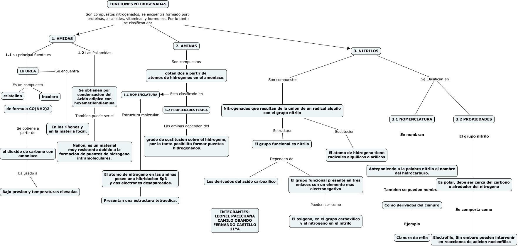 Este Cmap, tiene información relacionada con: TRABAJO DE QUIMICA, Anteponiendo a la palabra nitrilo el nombre del hidrocarburo. Tambien se pueden nombrar Como derivados del cianuro, el dioxido de carbono con amoniaco Es usado a Bajo presion y temperaturas elevadas, 3. NITRILOS Se Clasifican en 3.1 NOMENCLATURA, FUNCIONES NITROGENADAS Son compuestos nitrogenados, se encuentra formado por: proteinas, alcaloides, vitaminas y hormonas. Por lo tanto se clasifican en: 2. AMINAS, FUNCIONES NITROGENADAS Son compuestos nitrogenados, se encuentra formado por: proteinas, alcaloides, vitaminas y hormonas. Por lo tanto se clasifican en: 3. NITRILOS, Se obtienen por condensacion del Acido adipico con hexametilendiamina Tambien puede ser el Nailon, es un material muy resistente debido a la formacion de puentes de hidrogeno intramoleculares., obtenidos a partir de atomos de hidrogenos en el amoniaco. Esta clasificado en 1.1 NOMENCLATURA, El grupo funcional es nitrilo Dependen de Los derivados del acido carboxilico, FUNCIONES NITROGENADAS Son compuestos nitrogenados, se encuentra formado por: proteinas, alcaloides, vitaminas y hormonas. Por lo tanto se clasifican en: 1. AMIDAS, Como derivados del cianuro Ejemplo Cianuro de etilo, 3. NITRILOS Se Clasifican en 3.2 PROPIEDADES, Es polar, debe ser cerca del carbono o alrededor del nitrogeno Se comporta como Electrofilo, Sin embaro pueden intervenir en reacciones de adicion nucleofilica, 3.1 NOMENCLATURA Se nombran Anteponiendo a la palabra nitrilo el nombre del hidrocarburo., La UREA Se encuentra En los riñones y en la materia focal., 1.2 PROPIEDADES FISICA Las aminas dependen del grado de sustitucion sobre el hidrogeno, por lo tanto posibilita formar puentes hidrogenados., 1. AMIDAS 1.2 Las Poliamidas Se obtienen por condensacion del Acido adipico con hexametilendiamina, 1.1 NOMENCLATURA Estructura molecular Presentan una estructura tetraedica., El grupo funcional es nitrilo Dependen de El grupo funcional presente en tres enlaces con un elemento mas electronegativo, Nitrogenados que resultan de la union de un radical alquilo con el grupo nitrilo Estructura El grupo funcional es nitrilo, Nitrogenados que resultan de la union de un radical alquilo con el grupo nitrilo Sustitucion El atomo de hidrogeno tiene radicales alquilicos o arilicos