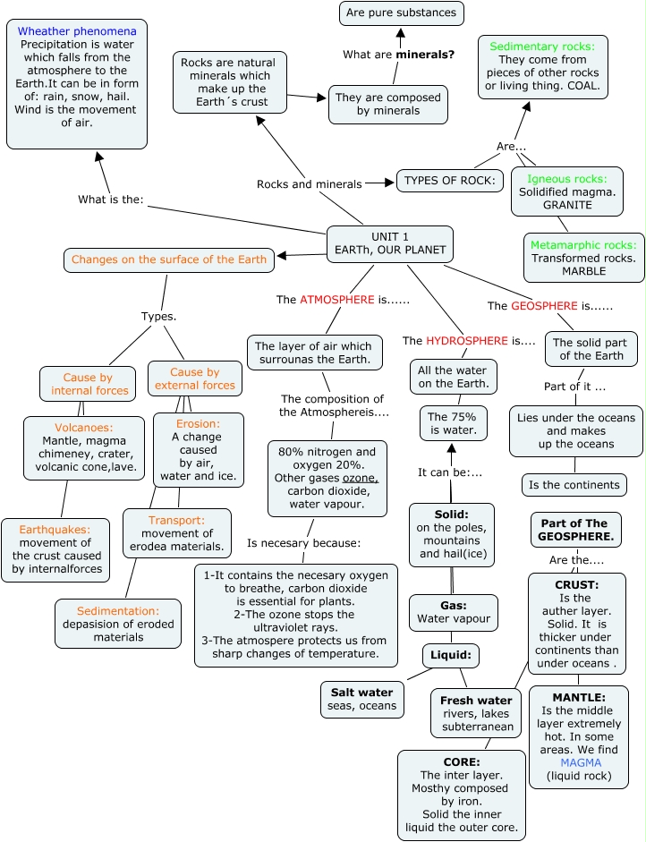 Este Cmap, tiene información relacionada con: Unidad 1, Liquid: ???? Fresh water rivers, lakes subterranean, UNIT 1 EARTh, OUR PLANET Rocks and minerals TYPES OF ROCK:, TYPES OF ROCK: Are... Metamarphic rocks: Transformed rocks. MARBLE, Solid: on the poles, mountains and hail(ice) It can be:... The 75% is water., Part of The GEOSPHERE. Are the.... CORE: The inter layer. Mosthy composed by iron. Solid the inner liquid the outer core., UNIT 1 EARTh, OUR PLANET What is the: Wheather phenomena Precipitation is water which falls from the atmosphere to the Earth.It can be in form of: rain, snow, hail. Wind is the movement of air., The layer of air which surrounas the Earth. The composition of the Atmosphereis.... 80% nitrogen and oxygen 20%. Other gases ozone, carbon dioxide, water vapour., 80% nitrogen and oxygen 20%. Other gases ozone, carbon dioxide, water vapour. Is necesary because: 1-It contains the necesary oxygen to breathe, carbon dioxide is essential for plants. 2-The ozone stops the ultraviolet rays. 3-The atmospere protects us from sharp changes of temperature., TYPES OF ROCK: Are... Igneous rocks: Solidified magma. GRANITE, UNIT 1 EARTh, OUR PLANET The GEOSPHERE is...... The solid part of the Earth, Changes on the surface of the Earth Types. Cause by internal forces, The solid part of the Earth Part of it ... Lies under the oceans and makes up the oceans, Part of The GEOSPHERE. Are the.... CRUST: Is the auther layer. Solid. It is thicker under continents than under oceans ., Cause by internal forces ???? Earthquakes: movement of the crust caused by internalforces, UNIT 1 EARTh, OUR PLANET ???? Changes on the surface of the Earth, Cause by external forces ???? Sedimentation: depasision of eroded materials, Rocks are natural minerals which make up the Earth´s crust ???? They are composed by minerals, Solid: on the poles, mountains and hail(ice) It can be:... Gas: Water vapour, Part of The GEOSPHERE. Are the.... MANTLE: Is the middle layer extremely hot. In some areas. We find MAGMA (liquid rock), Cause by external forces ???? Transport: movement of erodea materials.