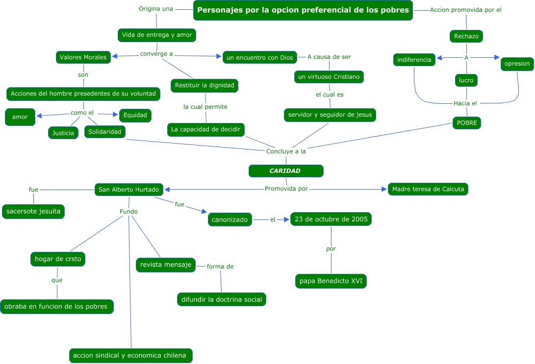 Este Cmap, tiene información relacionada con: personajes dedicados a la opcion...lolo, Rechazo A lucro, CARIDAD Promovida por Madre teresa de Calcuta, Personajes por la opcion preferencial de los pobres Accion promovida por el Rechazo, servidor y seguidor de jesus Concluye a la CARIDAD, Rechazo A opresion, San Alberto Hurtado Fundo accion sindical y economica chilena, Vida de entrega y amor converge a un encuentro con Dios, opresion Hacia el POBRE, Vida de entrega y amor converge a Restituir la dignidad, San Alberto Hurtado fue sacersote jesuita, Solidaridad Concluye a la CARIDAD, San Alberto Hurtado fue canonizado, Acciones del hombre presedentes de su voluntad como el Solidaridad, Restituir la dignidad la cual permite La capacidad de decidir, Rechazo A indiferencia, hogar de crsto que obraba en funcion de los pobres, Vida de entrega y amor converge a Valores Morales, canonizado el 23 de octubre de 2005, indiferencia Hacia el POBRE, un virtuoso Cristiano el cual es servidor y seguidor de jesus