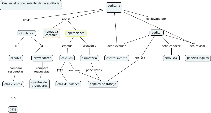 Este mapa conceptual tiene información relacionada a: roger, auditoria es llevada por auditor, auditoria debe evaluar control interno, circulares a clientes, auditoria revisa operaciones, auditor debe conocer empresa, operaciones efectua calculos, circulares a proveedores, proveedores compara respuestas cuentas de prveedores, ctas clientes ???? ????, calculos ???? ctas de balance
