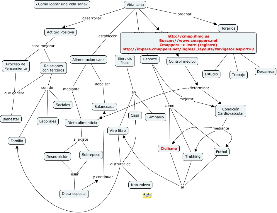 Este mapa conceptual tiene información relacionada a: vida_sana_2, Ejercicio fìsico en Casa, Alimentación sana debe ser Balanceada, Deporte como Ciclismo, Dieta alimenticia si existe Desnutrición, Actitud Positiva para mejorar Relaciones con terceros, Deporte como Trekking, Casa disfrutar de Familia, Ejercicio fìsico en Aire libre, Deporte como Futbol, Relaciones con terceros son de Familia