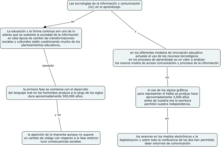 Este Cmap, tiene información relacionada con: las tics, Las tecnologías de la información y comunicación (tic) en el aprendizaje. en La educación y la forma continua son uno de lo pilares que se sustenta la sociedad de la información en esta época de cambio las transformaciones sociales y culturales están cuestionando mucho de los planteamientos educativos., el uso de los signos gráficos para representar el habla se produjo hace aproximadamente 3,500 años antes de nuestra era la escritura permitió nuestra independencia. en los avances en los medios electrónicos y la digitalizacion y sobre todo la confluencia de los dos han permitido idear entornos de comunicación, La educación y la forma continua son uno de lo pilares que se sustenta la sociedad de la información en esta época de cambio las transformaciones sociales y culturales están cuestionando mucho de los planteamientos educativos. también la primera fase se comienza con el desarrollo del lenguaje oral en los hominidos produce a lo largo de los siglos dura aproximadamente 500,000 años., en los diferentes modelos de innovación educativo actuales el uso de los recursos tecnológicos en los procesos de aprendizaje es un valor a analizar los nuevos modos de acceso comunicación y procesos de la información en el uso de los signos gráficos para representar el habla se produjo hace aproximadamente 3,500 años antes de nuestra era la escritura permitió nuestra independencia., Las tecnologías de la información y comunicación (tic) en el aprendizaje. y en los diferentes modelos de innovación educativo actuales el uso de los recursos tecnológicos en los procesos de aprendizaje es un valor a analizar los nuevos modos de acceso comunicación y procesos de la información, la primera fase se comienza con el desarrollo del lenguaje oral en los hominidos produce a lo largo de los siglos dura aproximadamente 500,000 años. y en la aparición de la imprenta aunque no supone un cambio de código con respecto a la fase anterior tuvo consecuencias sociales.
