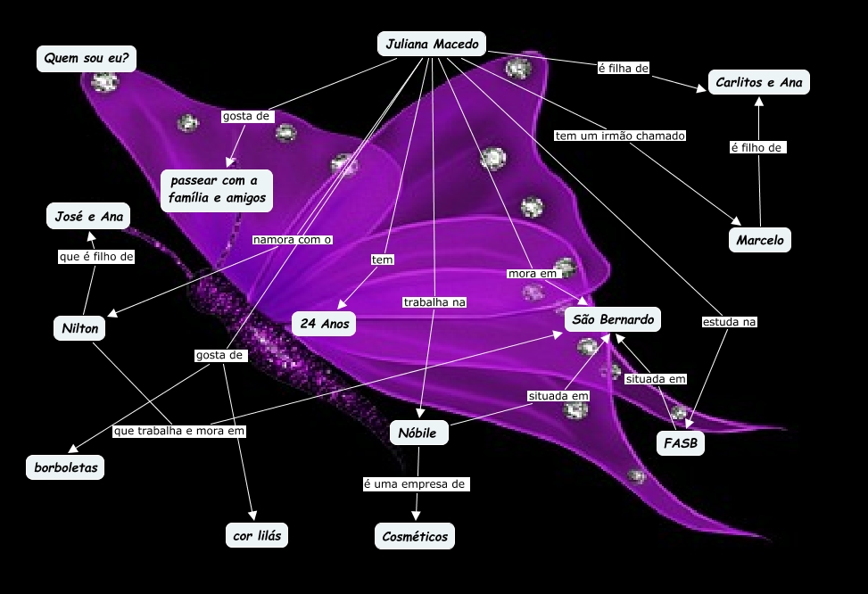 This Concept Map, created with IHMC CmapTools, has information related to: Juliana Macedo, Nilton que é filho de José e Ana, Juliana Macedo tem um irmão chamado Marcelo, Juliana Macedo trabalha na Nóbile, Juliana Macedo gosta de borboletas, Juliana Macedo namora com o Nilton, Juliana Macedo gosta de cor lilás, Marcelo é filho de Carlitos e Ana, Juliana Macedo tem 24 Anos, Nóbile é uma empresa de Cosméticos, Nóbile situada em São Bernardo, Juliana Macedo é filha de Carlitos e Ana, Juliana Macedo mora em São Bernardo, Nilton que trabalha e mora em São Bernardo, FASB situada em São Bernardo, Juliana Macedo estuda na FASB, Juliana Macedo gosta de passear com a família e amigos