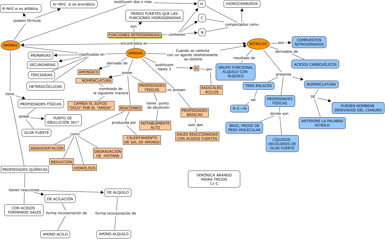 Este Cmap, tiene información relacionada con: FUNCIONES NITROGENADAS DE VERONICA ARANGO Y MAIRA TREJOS, REACIONES como DESHIDRATACIÓN, FUNCIONES NITROGENADAS contienen C, AMIDAS clasificadas en HETEROCÓCLICAS, AMINAS poseen fórmula Ar-NH2 si es aromático, FUNCIONES NITROGENADAS encontrados en AMIDAS, TRES ENLACES así R-C-=N, FUNCIONES NITROGENADAS contienen N, AMIDAS derivado de AMONIACO, PROPIEDADES QUÍMICAS tienen reacciones DE ACILACIÓN, NITRILOS resultado de GRUPO FUNCIONAL ALQUILO CON ALQUILO, PROPIEDADES BÁSICAS solo dan SALES REACCIONADAS CON ACIDOS FUERTES, AMIDAS posee NOMENCLATURA, FUNCIONES NITROGENADAS encontrados en NITRILOS, AMIDAS no poseen PROPIEDADES BÁSICAS, PROPIEDADES FÍSICAS tienei punto de ebullición NOTABLEMENTE ALTO, AMINAS clasificadas en HETEROCÓCLICAS, AMINAS clasificadas en TERCIARIAS, AMIDAS sustituyen hasta 3 H, REACIONES como DEGRADACIÓN DE HOTMAN, NITRILOS son COMPUESTOS NITROGENADOS