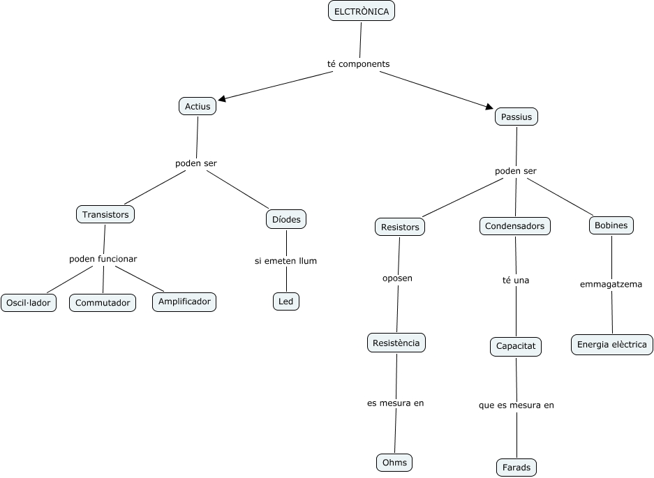 Este Cmap, tiene información relacionada con: rubén_anna_irina_mireia, Condensadors té una Capacitat, Díodes si emeten llum Led, Transistors poden funcionar Commutador, Actius poden ser Transistors, Transistors poden funcionar Amplificador, Resistència es mesura en Ohms, ELCTRÒNICA té components Passius, Resistors oposen Resistència, Passius poden ser Resistors, Actius poden ser Díodes, Passius poden ser Condensadors, Passius poden ser Bobines, Bobines emmagatzema Energia elèctrica, Capacitat que es mesura en Farads, ELCTRÒNICA té components Actius, Transistors poden funcionar Oscil·lador