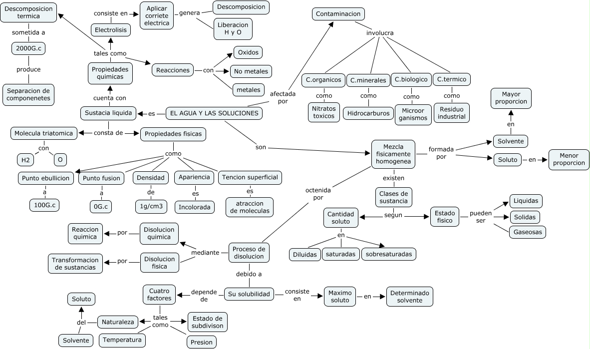 Este Cmap, tiene información relacionada con: Quimica Organica, Propiedades quimicas tales como Descomposicion termica, Cantidad soluto en sobresaturadas, C.minerales como Hidrocarburos, Punto ebullicion a 100G.c, Descomposicion genera Liberacion H y O, Aplicar corriete electrica genera Liberacion H y O, Mezcla fisicamente homogenea octenida por Proceso de disolucion, Clases de sustancia segun Estado fisico, Proceso de disolucion mediante Disolucion quimica, Molecula triatomica con H2, C.biologico como Microor ganismos, Tencion superficial es atraccion de moleculas, Apariencia es Incolorada, Proceso de disolucion debido a Su solubilidad, Punto fusion a 0G.c, Reacciones con metales, Maximo soluto en Determinado solvente, Molecula triatomica con H2, Soluto en Menor proporcion, EL AGUA Y LAS SOLUCIONES afectada por Contaminacion