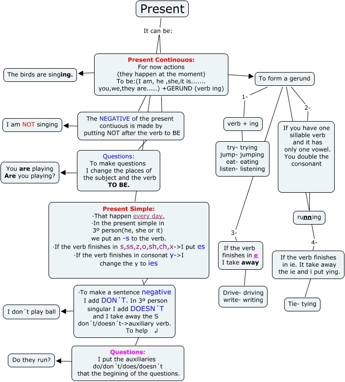 Este Cmap, tiene información relacionada con: Present, ·To make a sentence negative I add DON´T. In 3º person singular I add DOESN´T and I take away the S don´t/doesn´t->auxiliary verb. To help ↲ ???? I don´t play ball, To form a gerund 2- If you have one sillable verb and it has only one vowel. You double the consonant, verb + ing ???? try- trying jump- jumping eat- eating listen- listening, Questions: I put the auxiliaries do/don´t/does/doesn´t that the begining of the questions. ???? Do they run?, Present Continouos: For now actions (they happen at the moment) To be:(I am, he ,she,it is....... you,we,they are.....) +GERUND (verb ing) ???? To form a gerund, The NEGATIVE of the present contiuous is made by putting NOT after the verb to BE ???? I am NOT singing, Present Continouos: For now actions (they happen at the moment) To be:(I am, he ,she,it is....... you,we,they are.....) +GERUND (verb ing) ???? Questions: To make questions I change the places of the subject and the verb TO BE., To form a gerund 1- verb + ing, If you have one sillable verb and it has only one vowel. You double the consonant ???? running, If the verb finishes in e I take away ???? Drive- driving write- writing, Present It can be: Present Simple: ·That happen every day. ·In the present simple in 3º person(he, she or it) we put an -s to the verb. ·If the verb finishes in s,ss,z,o,sh,ch,x->I put es ·If the verb finishes in consonat y->I change the y to ies, Present It can be: Present Continouos: For now actions (they happen at the moment) To be:(I am, he ,she,it is....... you,we,they are.....) +GERUND (verb ing), ·To make a sentence negative I add DON´T. In 3º person singular I add DOESN´T and I take away the S don´t/doesn´t->auxiliary verb. To help ↲ ???? Present Simple: ·That happen every day. ·In the present simple in 3º person(he, she or it) we put an -s to the verb. ·If the verb finishes in s,ss,z,o,sh,ch,x->I put es ·If the verb finishes in consonat y->I change the y to ies, To form a gerund 4- If the verb finishes in ie. It take away the ie and i put ying., Questions: To make questions I change the places of the subject and the verb TO BE. ???? You are playing Are you playing?, Present Continouos: For now actions (they happen at the moment) To be:(I am, he ,she,it is....... you,we,they are.....) +GERUND (verb ing) ???? The birds are singing., To form a gerund 3- If the verb finishes in e I take away, Present Continouos: For now actions (they happen at the moment) To be:(I am, he ,she,it is....... you,we,they are.....) +GERUND (verb ing) ???? The NEGATIVE of the present contiuous is made by putting NOT after the verb to BE, Present Simple: ·That happen every day. ·In the present simple in 3º person(he, she or it) we put an -s to the verb. ·If the verb finishes in s,ss,z,o,sh,ch,x->I put es ·If the verb finishes in consonat y->I change the y to ies ???? Questions: I put the auxiliaries do/don´t/does/doesn´t that the begining of the questions., If the verb finishes in ie. It take away the ie and i put ying. ???? Tie- tying