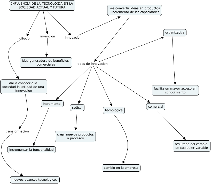 Este Cmap, tiene información relacionada con: la tecnologia (jefersson gabriel perez 11-b), organizativa ???? facilita un mayor acceso al conocimiento, INFLUENCIA DE LA TECNOLOGIA EN LA SOCIEDAD ACTUAL Y FUTURA innovacion -es convertir ideas en productos -incremento de las capacidades, INFLUENCIA DE LA TECNOLOGIA EN LA SOCIEDAD ACTUAL Y FUTURA invencion idea generadora de beneficios comerciales, incremental ???? incrementar la funcionalidad, tecnologica ???? cambio en la empresa, -es convertir ideas en productos -incremento de las capacidades tipos de innovacion incremental, dar a conocer a la sociedad la utilidad de una innovacion transformacion nuevos avances tecnologicos, comercial ???? resultado del cambio de cualquier variable, -es convertir ideas en productos -incremento de las capacidades tipos de innovacion tecnologica, -es convertir ideas en productos -incremento de las capacidades tipos de innovacion comercial, -es convertir ideas en productos -incremento de las capacidades tipos de innovacion organizativa, -es convertir ideas en productos -incremento de las capacidades tipos de innovacion radical, INFLUENCIA DE LA TECNOLOGIA EN LA SOCIEDAD ACTUAL Y FUTURA difucion dar a conocer a la sociedad la utilidad de una innovacion, radical ???? crear nuevos productos o procesos