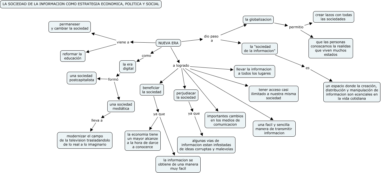 Este Cmap, tiene información relacionada con: TECNOLOGIA Y SOCIEDAD (JOSE OTERO), una sociedad mediática lleva a modernizar el campo de la television trasladandolo de lo real a lo imaginario, la "sociedad de la informacion" es un espacio donde la creación, distribución y manipulación de informacion son ecenciales en la vida cotidiana, NUEVA ERA a logrado tener acceso casi ilimitado a nuestra misma sociedad, NUEVA ERA a logrado llevar la informacion a todos los lugares, la globalizacion permitio crear lazos con todas las sociedades, la era digital formó una sociedad mediática, NUEVA ERA como la era digital, NUEVA ERA viene a permaneser y cambiar la sociedad, NUEVA ERA a logrado perjudiacar la sociedad, la era digital formó una sociedad postcapitalista, la globalizacion permitio que las personas conoscamos la realidas que viven muchos estados, NUEVA ERA a logrado beneficiar la sociedad, NUEVA ERA viene a reformar la educación, perjudiacar la sociedad ya que algunas vias de informacion estan infestadas de ideas corruptas y malevolas, beneficiar la sociedad ya que la informacion se obtiene de una manera muy facil, beneficiar la sociedad ya que la economia tiene un mayor alcanze a la hora de darce a conocerce, NUEVA ERA dio paso a la globalizacion, NUEVA ERA a logrado una facil y sencilla manera de transmitir informacion, NUEVA ERA dio paso a la "sociedad de la informacion", NUEVA ERA a logrado importantes cambios en los medios de comunicacion