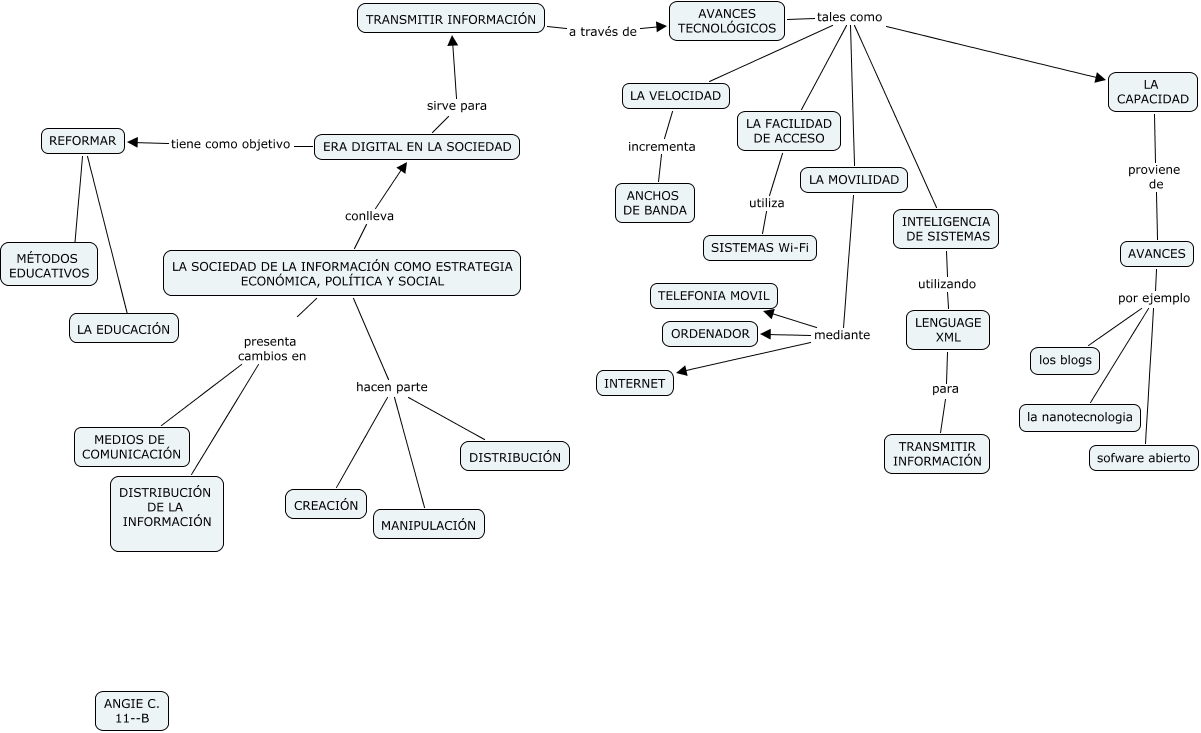 Este Cmap, tiene información relacionada con: Angie C, LENGUAGE XML para TRANSMITIR INFORMACIÓN, AVANCES por ejemplo los blogs, LA SOCIEDAD DE LA INFORMACIÓN COMO ESTRATEGIA ECONÓMICA, POLÍTICA Y SOCIAL hacen parte DISTRIBUCIÓN, LA MOVILIDAD mediante INTERNET, INTELIGENCIA DE SISTEMAS utilizando LENGUAGE XML, LA SOCIEDAD DE LA INFORMACIÓN COMO ESTRATEGIA ECONÓMICA, POLÍTICA Y SOCIAL hacen parte MANIPULACIÓN, ERA DIGITAL EN LA SOCIEDAD tiene como objetivo REFORMAR, LA MOVILIDAD mediante TELEFONIA MOVIL, AVANCES por ejemplo la nanotecnologia, LA VELOCIDAD incrementa ANCHOS DE BANDA, AVANCES TECNOLÓGICOS tales como LA FACILIDAD DE ACCESO, AVANCES TECNOLÓGICOS tales como LA CAPACIDAD, LA SOCIEDAD DE LA INFORMACIÓN COMO ESTRATEGIA ECONÓMICA, POLÍTICA Y SOCIAL presenta cambios en MEDIOS DE COMUNICACIÓN, AVANCES TECNOLÓGICOS tales como LA VELOCIDAD, REFORMAR ???? MÉTODOS EDUCATIVOS, TRANSMITIR INFORMACIÓN a través de AVANCES TECNOLÓGICOS, LA SOCIEDAD DE LA INFORMACIÓN COMO ESTRATEGIA ECONÓMICA, POLÍTICA Y SOCIAL conlleva ERA DIGITAL EN LA SOCIEDAD, LA CAPACIDAD proviene de AVANCES, AVANCES por ejemplo sofware abierto, REFORMAR ???? LA EDUCACIÓN