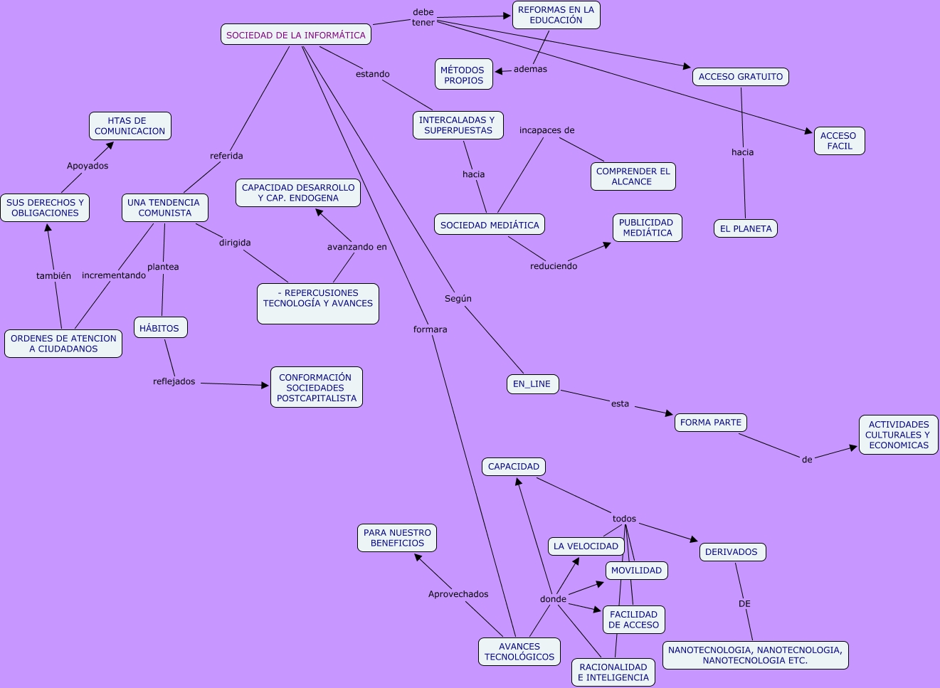 Este Cmap, tiene información relacionada con: INFORMATICA, SOCIEDAD MEDIÁTICA incapaces de COMPRENDER EL ALCANCE, AVANCES TECNOLÓGICOS donde RACIONALIDAD E INTELIGENCIA, SUS DERECHOS Y OBLIGACIONES Apoyados HTAS DE COMUNICACION, INTERCALADAS Y SUPERPUESTAS hacia SOCIEDAD MEDIÁTICA, ORDENES DE ATENCION A CIUDADANOS también SUS DERECHOS Y OBLIGACIONES, AVANCES TECNOLÓGICOS donde FACILIDAD DE ACCESO, REFORMAS EN LA EDUCACIÓN ademas MÉTODOS PROPIOS, UNA TENDENCIA COMUNISTA plantea HÁBITOS, EN_LINE esta FORMA PARTE, RACIONALIDAD E INTELIGENCIA todos DERIVADOS, SOCIEDAD DE LA INFORMÁTICA debe tener ACCESO GRATUITO, - REPERCUSIONES TECNOLOGÍA Y AVANCES avanzando en CAPACIDAD DESARROLLO Y CAP. ENDOGENA, HÁBITOS reflejados CONFORMACIÓN SOCIEDADES POSTCAPITALISTA, SOCIEDAD MEDIÁTICA reduciendo PUBLICIDAD MEDIÁTICA, FACILIDAD DE ACCESO todos DERIVADOS, CAPACIDAD todos DERIVADOS, AVANCES TECNOLÓGICOS donde MOVILIDAD, SOCIEDAD DE LA INFORMÁTICA debe tener REFORMAS EN LA EDUCACIÓN, SOCIEDAD DE LA INFORMÁTICA formara AVANCES TECNOLÓGICOS, AVANCES TECNOLÓGICOS donde LA VELOCIDAD