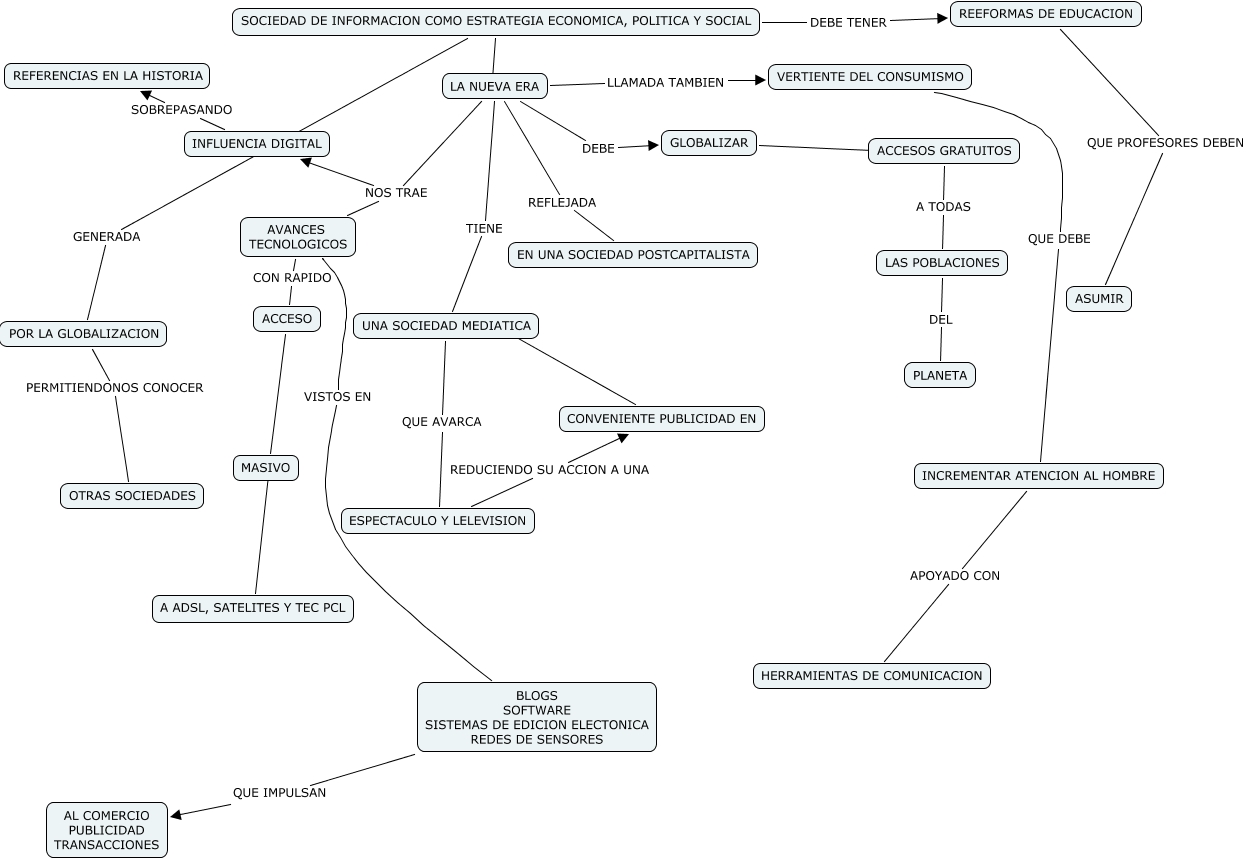 Este Cmap, tiene información relacionada con: FERNANDA, POR LA GLOBALIZACION PERMITIENDONOS CONOCER OTRAS SOCIEDADES, LA NUEVA ERA NOS TRAE AVANCES TECNOLOGICOS, LA NUEVA ERA TIENE UNA SOCIEDAD MEDIATICA, INCREMENTAR ATENCION AL HOMBRE APOYADO CON HERRAMIENTAS DE COMUNICACION, SOCIEDAD DE INFORMACION COMO ESTRATEGIA ECONOMICA, POLITICA Y SOCIAL LA NUEVA ERA, CONVENIENTE PUBLICIDAD EN ???? UNA SOCIEDAD MEDIATICA, BLOGS SOFTWARE SISTEMAS DE EDICION ELECTONICA REDES DE SENSORES QUE IMPULSAN AL COMERCIO PUBLICIDAD TRANSACCIONES, VERTIENTE DEL CONSUMISMO QUE DEBE INCREMENTAR ATENCION AL HOMBRE, AVANCES TECNOLOGICOS VISTOS EN BLOGS SOFTWARE SISTEMAS DE EDICION ELECTONICA REDES DE SENSORES, UNA SOCIEDAD MEDIATICA QUE AVARCA ESPECTACULO Y LELEVISION, LA NUEVA ERA DEBE GLOBALIZAR, ESPECTACULO Y LELEVISION REDUCIENDO SU ACCION A UNA CONVENIENTE PUBLICIDAD EN, GLOBALIZAR ???? ACCESOS GRATUITOS, REEFORMAS DE EDUCACION QUE PROFESORES DEBEN ASUMIR, INFLUENCIA DIGITAL SOBREPASANDO REFERENCIAS EN LA HISTORIA, AVANCES TECNOLOGICOS CON RAPIDO ACCESO, LA NUEVA ERA LLAMADA TAMBIEN VERTIENTE DEL CONSUMISMO, LA NUEVA ERA NOS TRAE INFLUENCIA DIGITAL, ACCESOS GRATUITOS A TODAS LAS POBLACIONES, ACCESO A ADSL, SATELITES Y TEC PCL