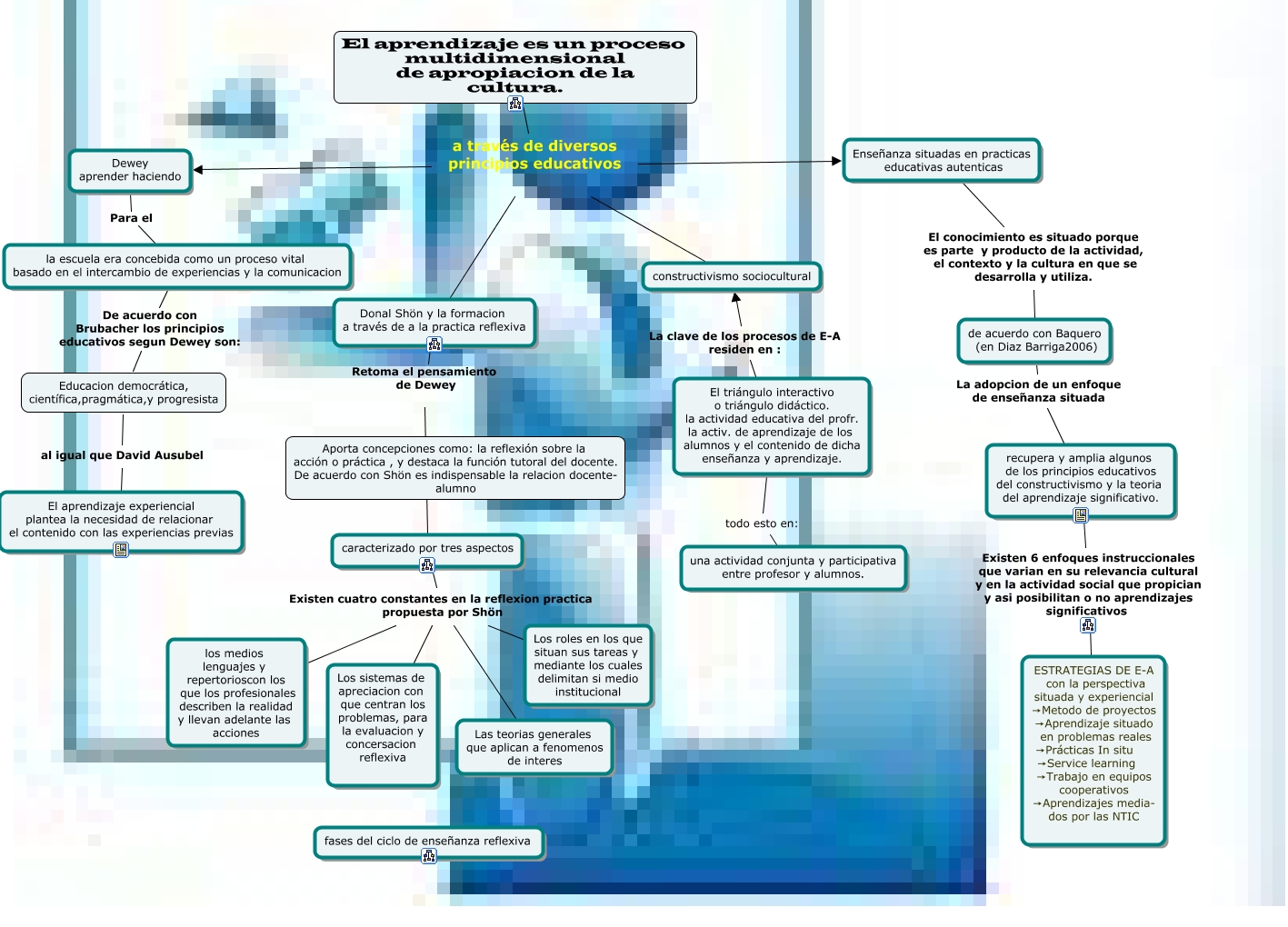 Este Cmap, tiene información relacionada con: primer capitulo, El triángulo interactivo o triángulo didáctico. la actividad educativa del profr. la activ. de aprendizaje de los alumnos y el contenido de dicha enseñanza y aprendizaje. La clave de los procesos de E-A residen en : constructivismo sociocultural, Donal Shön y la formacion a través de a la practica reflexiva Retoma el pensamiento de Dewey caracterizado por tres aspectos, de acuerdo con Baquero (en Diaz Barriga2006) La adopcion de un enfoque de enseñanza situada recupera y amplia algunos de los principios educativos del constructivismo y la teoria del aprendizaje significativo., El triángulo interactivo o triángulo didáctico. la actividad educativa del profr. la activ. de aprendizaje de los alumnos y el contenido de dicha enseñanza y aprendizaje. todo esto en: una actividad conjunta y participativa entre profesor y alumnos., caracterizado por tres aspectos Existen cuatro constantes en la reflexion practica propuesta por Shön los medios lenguajes y repertorioscon los que los profesionales describen la realidad y llevan adelante las acciones, recupera y amplia algunos de los principios educativos del constructivismo y la teoria del aprendizaje significativo. Existen 6 enfoques instruccionales que varian en su relevancia cultural y en la actividad social que propician y asi posibilitan o no aprendizajes significativos ESTRATEGIAS DE E-A con la perspectiva situada y experiencial →Metodo de proyectos →Aprendizaje situado en problemas reales →Prácticas In situ →Service learning →Trabajo en equipos cooperativos →Aprendizajes media- dos por las NTIC, El aprendizaje es un proceso multidimensional de apropiacion de la cultura. a través de diversos principios educativos Dewey aprender haciendo, la escuela era concebida como un proceso vital basado en el intercambio de experiencias y la comunicacion De acuerdo con Brubacher los principios educativos segun Dewey son: Educacion democrática, científica,pragmática,y progresista, caracterizado por tres aspectos Existen cuatro constantes en la reflexion practica propuesta por Shön Los roles en los que situan sus tareas y mediante los cuales delimitan si medio institucional, Enseñanza situadas en practicas educativas autenticas El conocimiento es situado porque es parte y producto de la actividad, el contexto y la cultura en que se desarrolla y utiliza. de acuerdo con Baquero (en Diaz Barriga2006), El aprendizaje es un proceso multidimensional de apropiacion de la cultura. a través de diversos principios educativos Enseñanza situadas en practicas educativas autenticas, El aprendizaje es un proceso multidimensional de apropiacion de la cultura. a través de diversos principios educativos constructivismo sociocultural, Dewey aprender haciendo Para el la escuela era concebida como un proceso vital basado en el intercambio de experiencias y la comunicacion, caracterizado por tres aspectos Existen cuatro constantes en la reflexion practica propuesta por Shön Las teorias generales que aplican a fenomenos de interes, Educacion democrática, científica,pragmática,y progresista al igual que David Ausubel El aprendizaje experiencial plantea la necesidad de relacionar el contenido con las experiencias previas, caracterizado por tres aspectos Existen cuatro constantes en la reflexion practica propuesta por Shön Los sistemas de apreciacion con que centran los problemas, para la evaluacion y concersacion reflexiva, El aprendizaje es un proceso multidimensional de apropiacion de la cultura. a través de diversos principios educativos Donal Shön y la formacion a través de a la practica reflexiva