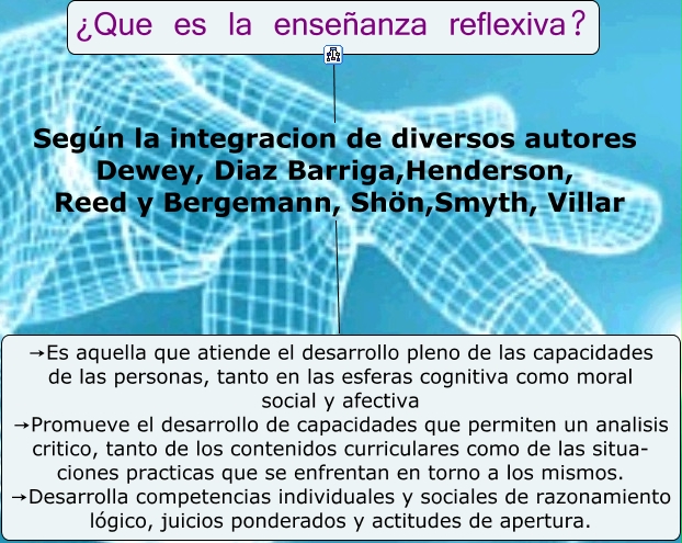 Este Cmap, tiene información relacionada con: enseñanza reflexiva, ¿Que es la enseñanza reflexiva? Según la integracion de diversos autores Dewey, Diaz Barriga,Henderson, Reed y Bergemann, Shön,Smyth, Villar →Es aquella que atiende el desarrollo pleno de las capacidades de las personas, tanto en las esferas cognitiva como moral social y afectiva →Promueve el desarrollo de capacidades que permiten un analisis critico, tanto de los contenidos curriculares como de las situa- ciones practicas que se enfrentan en torno a los mismos. →Desarrolla competencias individuales y sociales de razonamiento lógico, juicios ponderados y actitudes de apertura.