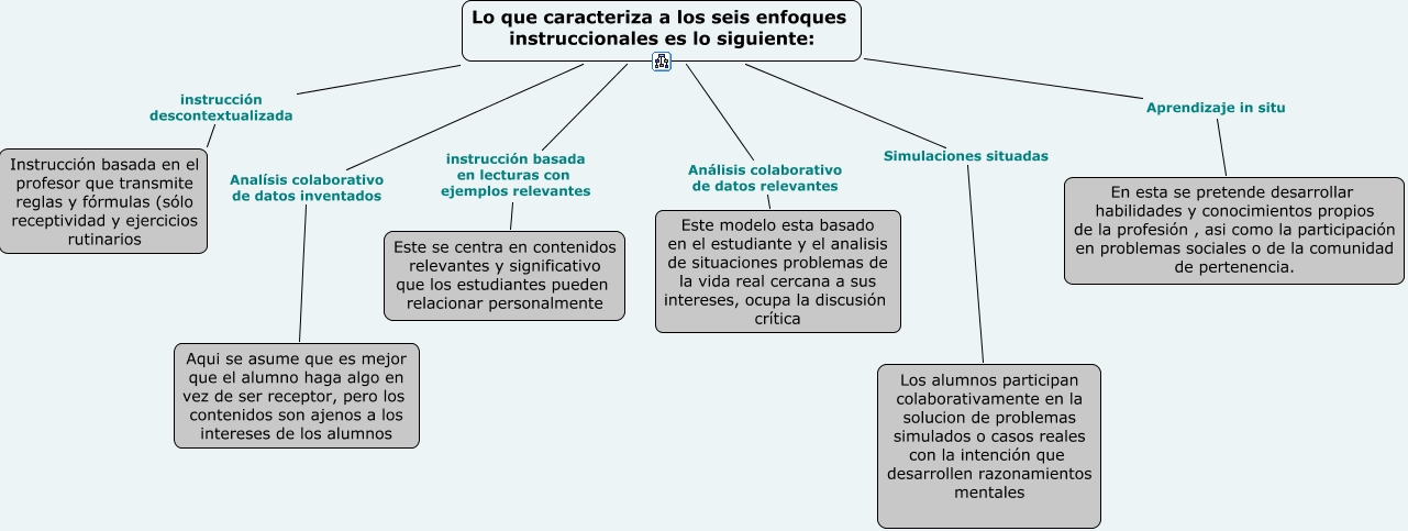 Este Cmap, tiene información relacionada con: enfoques instruccionales, Lo que caracteriza a los seis enfoques instruccionales es lo siguiente: Aprendizaje in situ En esta se pretende desarrollar habilidades y conocimientos propios de la profesión , asi como la participación en problemas sociales o de la comunidad de pertenencia., Lo que caracteriza a los seis enfoques instruccionales es lo siguiente: Simulaciones situadas Los alumnos participan colaborativamente en la solucion de problemas simulados o casos reales con la intención que desarrollen razonamientos mentales, Lo que caracteriza a los seis enfoques instruccionales es lo siguiente: instrucción descontextualizada Instrucción basada en el profesor que transmite reglas y fórmulas (sólo receptividad y ejercicios rutinarios, Lo que caracteriza a los seis enfoques instruccionales es lo siguiente: Análisis colaborativo de datos relevantes Este modelo esta basado en el estudiante y el analisis de situaciones problemas de la vida real cercana a sus intereses, ocupa la discusión crítica, Lo que caracteriza a los seis enfoques instruccionales es lo siguiente: Analísis colaborativo de datos inventados Aqui se asume que es mejor que el alumno haga algo en vez de ser receptor, pero los contenidos son ajenos a los intereses de los alumnos, Lo que caracteriza a los seis enfoques instruccionales es lo siguiente: instrucción basada en lecturas con ejemplos relevantes Este se centra en contenidos relevantes y significativo que los estudiantes pueden relacionar personalmente