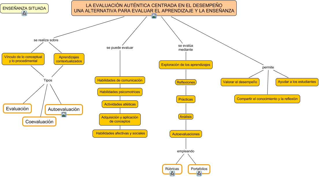 Este Cmap, tiene información relacionada con: 05 evaluación, LA EVALUACIÓN AUTÉNTICA CENTRADA EN EL DESEMPEÑO UNA ALTERNATIVA PARA EVALUAR EL APRENDIZAJE Y LA ENSEÑANZA se realiza sobre Vínculo de lo conceptual y lo procedimental, LA EVALUACIÓN AUTÉNTICA CENTRADA EN EL DESEMPEÑO UNA ALTERNATIVA PARA EVALUAR EL APRENDIZAJE Y LA ENSEÑANZA permite Compartir el conocimiento y la reflexión, Vínculo de lo conceptual y lo procedimental Tipos Coevaluación, Exploración de los aprendizajes Reflexiones Prácticas, LA EVALUACIÓN AUTÉNTICA CENTRADA EN EL DESEMPEÑO UNA ALTERNATIVA PARA EVALUAR EL APRENDIZAJE Y LA ENSEÑANZA permite Ayudar a los estudiantes, LA EVALUACIÓN AUTÉNTICA CENTRADA EN EL DESEMPEÑO UNA ALTERNATIVA PARA EVALUAR EL APRENDIZAJE Y LA ENSEÑANZA se evalúa mediante Exploración de los aprendizajes, LA EVALUACIÓN AUTÉNTICA CENTRADA EN EL DESEMPEÑO UNA ALTERNATIVA PARA EVALUAR EL APRENDIZAJE Y LA ENSEÑANZA se puede evaluar Habilidades de comunicación, LA EVALUACIÓN AUTÉNTICA CENTRADA EN EL DESEMPEÑO UNA ALTERNATIVA PARA EVALUAR EL APRENDIZAJE Y LA ENSEÑANZA se puede evaluar Habilidades afectivas y sociales, LA EVALUACIÓN AUTÉNTICA CENTRADA EN EL DESEMPEÑO UNA ALTERNATIVA PARA EVALUAR EL APRENDIZAJE Y LA ENSEÑANZA se puede evaluar Actividades atléticas, Prácticas Análisis Autoevaluaciones, LA EVALUACIÓN AUTÉNTICA CENTRADA EN EL DESEMPEÑO UNA ALTERNATIVA PARA EVALUAR EL APRENDIZAJE Y LA ENSEÑANZA se puede evaluar Habilidades psicomotrices, Autoevaluaciones empleando Rúbricas, LA EVALUACIÓN AUTÉNTICA CENTRADA EN EL DESEMPEÑO UNA ALTERNATIVA PARA EVALUAR EL APRENDIZAJE Y LA ENSEÑANZA se puede evaluar Adquisición y aplicación de conceptos, LA EVALUACIÓN AUTÉNTICA CENTRADA EN EL DESEMPEÑO UNA ALTERNATIVA PARA EVALUAR EL APRENDIZAJE Y LA ENSEÑANZA permite Valorar el desempeño, Aprendizajes contextualizados Tipos Coevaluación, LA EVALUACIÓN AUTÉNTICA CENTRADA EN EL DESEMPEÑO UNA ALTERNATIVA PARA EVALUAR EL APRENDIZAJE Y LA ENSEÑANZA se realiza sobre Aprendizajes contextualizados, Aprendizajes contextualizados Tipos Evaluación, Autoevaluaciones empleando Portafolios, Vínculo de lo conceptual y lo procedimental Tipos Autoevaluación, Aprendizajes contextualizados Tipos Autoevaluación