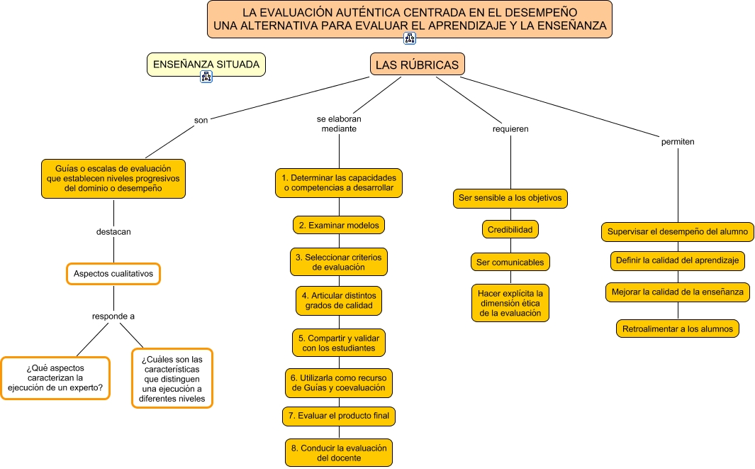 Este Cmap, tiene información relacionada con: 05 rubricas, LAS RÚBRICAS requieren Ser sensible a los objetivos, LAS RÚBRICAS requieren Credibilidad, LAS RÚBRICAS requieren Hacer explícita la dimensión ética de la evaluación, LAS RÚBRICAS permiten Mejorar la calidad de la enseñanza, LAS RÚBRICAS se elaboran mediante 5. Compartir y validar con los estudiantes, LAS RÚBRICAS se elaboran mediante 3. Seleccionar criterios de evaluación, LAS RÚBRICAS se elaboran mediante 2. Examinar modelos, LAS RÚBRICAS son Guías o escalas de evaluación que establecen niveles progresivos del dominio o desempeño, LAS RÚBRICAS se elaboran mediante 7. Evaluar el producto final, LAS RÚBRICAS permiten Supervisar el desempeño del alumno, LAS RÚBRICAS se elaboran mediante 8. Conducir la evaluación del docente, LAS RÚBRICAS se elaboran mediante 6. Utilizarla como recurso de Guías y coevaluación, Aspectos cualitativos responde a ¿Qué aspectos caracterizan la ejecución de un experto?, LAS RÚBRICAS permiten Retroalimentar a los alumnos, LAS RÚBRICAS se elaboran mediante 1. Determinar las capacidades o competencias a desarrollar, Aspectos cualitativos responde a ¿Cuáles son las características que distinguen una ejecución a diferentes niveles, LAS RÚBRICAS requieren Ser comunicables, LAS RÚBRICAS permiten Definir la calidad del aprendizaje, Guías o escalas de evaluación que establecen niveles progresivos del dominio o desempeño destacan Aspectos cualitativos, LAS RÚBRICAS se elaboran mediante 4. Articular distintos grados de calidad