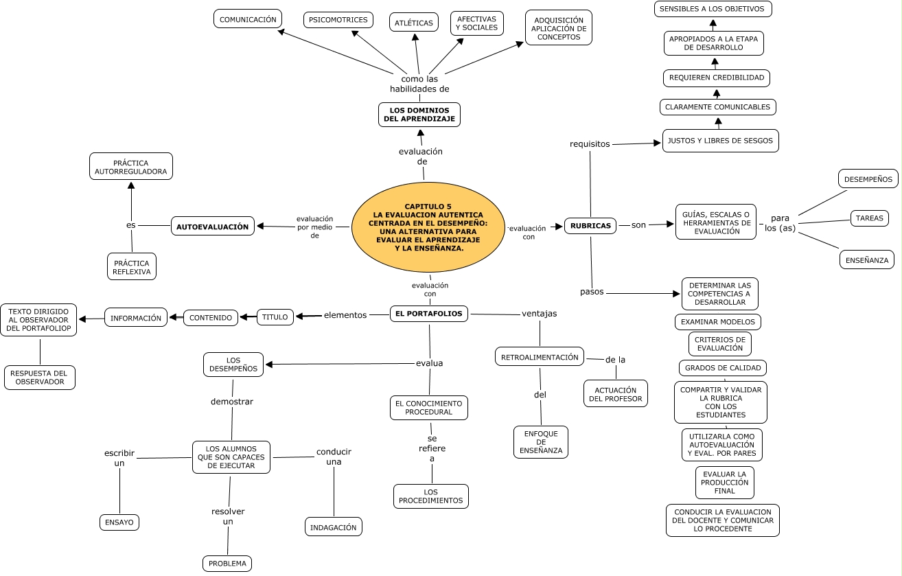 Este Cmap, tiene información relacionada con: CAPITULO 5, REQUIEREN CREDIBILIDAD ???? APROPIADOS A LA ETAPA DE DESARROLLO, AUTOEVALUACIÓN es PRÁCTICA REFLEXIVA, JUSTOS Y LIBRES DE SESGOS ???? CLARAMENTE COMUNICABLES, EL PORTAFOLIOS elementos CONTENIDO, LOS DOMINIOS DEL APRENDIZAJE como las habilidades de COMUNICACIÓN, LOS DOMINIOS DEL APRENDIZAJE como las habilidades de ADQUISICIÓN APLICACIÓN DE CONCEPTOS, LOS DOMINIOS DEL APRENDIZAJE como las habilidades de AFECTIVAS Y SOCIALES, LOS ALUMNOS QUE SON CAPACES DE EJECUTAR resolver un PROBLEMA, EL CONOCIMIENTO PROCEDURAL se refiere a LOS PROCEDIMIENTOS, RUBRICAS son GUÍAS, ESCALAS O HERRAMIENTAS DE EVALUACIÓN, RETROALIMENTACIÓN de la ACTUACIÓN DEL PROFESOR, EL PORTAFOLIOS elementos TITULO, EL PORTAFOLIOS evalua LOS DESEMPEÑOS, COMPARTIR Y VALIDAR LA RUBRICA CON LOS ESTUDIANTES ???? UTILIZARLA COMO AUTOEVALUACIÓN Y EVAL. POR PARES, CAPITULO 5 LA EVALUACION AUTENTICA CENTRADA EN EL DESEMPEÑO: UNA ALTERNATIVA PARA EVALUAR EL APRENDIZAJE Y LA ENSEÑANZA. evaluación por medio de AUTOEVALUACIÓN, EXAMINAR MODELOS ???? CRITERIOS DE EVALUACIÓN, TEXTO DIRIGIDO AL OBSERVADOR DEL PORTAFOLIOP ???? RESPUESTA DEL OBSERVADOR, CAPITULO 5 LA EVALUACION AUTENTICA CENTRADA EN EL DESEMPEÑO: UNA ALTERNATIVA PARA EVALUAR EL APRENDIZAJE Y LA ENSEÑANZA. evaluación con RUBRICAS, RUBRICAS requisitos JUSTOS Y LIBRES DE SESGOS, LOS DOMINIOS DEL APRENDIZAJE como las habilidades de PSICOMOTRICES