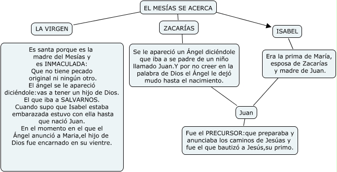 Este Cmap, tiene información relacionada con: religión tema 2, ISABEL Era la prima de María, esposa de Zacarías y madre de Juan., Juan ???? Fue el PRECURSOR:que preparaba y anunciaba los caminos de Jesúas y fue el que bautizó a Jesús,su primo., Juan ???? Era la prima de María, esposa de Zacarías y madre de Juan., ZACARÍAS ???? Se le apareció un Ángel diciéndole que iba a se padre de un niño llamado Juan.Y por no creer en la palabra de Dios el Ángel le dejó mudo hasta el nacimiento., LA VIRGEN ???? EL MESÍAS SE ACERCA, Se le apareció un Ángel diciéndole que iba a se padre de un niño llamado Juan.Y por no creer en la palabra de Dios el Ángel le dejó mudo hasta el nacimiento. ???? Juan, EL MESÍAS SE ACERCA ZACARÍAS ZACARÍAS, EL MESÍAS SE ACERCA ISABEL
