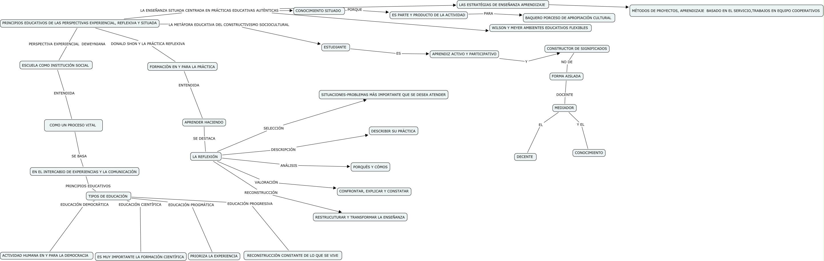 Este Cmap, tiene información relacionada con: CAPITULO 1, PRINCIPIOS EDUCATIVOS DE LAS PERSPECTIVAS EXPERIENCIAL, REFLEXIVA Y SITUADA LA METÁFORA EDUCATIVA DEL CONSTRUCTIVISMO SOCIOCULTURAL ESTUDIANTE, PRINCIPIOS EDUCATIVOS DE LAS PERSPECTIVAS EXPERIENCIAL, REFLEXIVA Y SITUADA DONALD SHON Y LA PRÁCTICA REFLEXIVA FORMACIÒN EN Y PARA LA PRÀCTICA, TIPOS DE EDUCACIÓN EDUCACIÓN CIENTÍFICA ES MUY IMPORTANTE LA FORMACIÓN CIENTÍFICA, LA REFLEXIÓN DESCRIPCIÓN DESCRIBIR SU PRÁCTICA, TIPOS DE EDUCACIÓN EDUCACIÓN PROGMÁTICA PRIORIZA LA EXPERIENCIA, LAS ESTRATÉGIAS DE ENSEÑANZA APRENDIZAJE ???? MÉTODOS DE PROYECTOS, APRENDIZAJE BASADO EN EL SERVICIO,TRABAJOS EN EQUIPO COOPERATIVOS, PRINCIPIOS EDUCATIVOS DE LAS PERSPECTIVAS EXPERIENCIAL, REFLEXIVA Y SITUADA LA ENSEÑANZA SITUADA CENTRADA EN PRÁCTICAS EDUCATIVAS AUTÈNTICAS CONOCIMIENTO SITUADO, TIPOS DE EDUCACIÓN EDUCACIÓN DEMOCRÀTICA ACTIVIDAD HUMANA EN Y PARA LA DEMOCRACIA, ESTUDIANTE ES APRENDIZ ACTIVO Y PARTICIPATIVO, LA REFLEXIÓN ANÁLISIS PORQUÉS Y CÓMOS, TIPOS DE EDUCACIÓN EDUCACIÓN PROGRESIVA RECONSTRUCCIÒN CONSTANTE DE LO QUE SE VIVE, CONOCIMIENTO SITUADO PORQUE ES PARTE Y PRODUCTO DE LA ACTIVIDAD, PRINCIPIOS EDUCATIVOS DE LAS PERSPECTIVAS EXPERIENCIAL, REFLEXIVA Y SITUADA PERSPECTIVA EXPERIENCIAL DEWEYNIANA ESCUELA COMO INSTITUCIÓN SOCIAL, FORMACIÒN EN Y PARA LA PRÀCTICA ENTENDIDA APRENDER HACIENDO, EN EL INTERCABIO DE EXPERIENCIAS Y LA COMUNICACIÒN PRINCIPIOS EDUCATIVOS TIPOS DE EDUCACIÓN, APRENDIZ ACTIVO Y PARTICIPATIVO Y CONSTRUCTOR DE SIGNIFICADOS, LA REFLEXIÓN RECONSTRUCCIÓN RESTRUCUTURAR Y TRANSFORMAR LA ENSEÑANZA, PRINCIPIOS EDUCATIVOS DE LAS PERSPECTIVAS EXPERIENCIAL, REFLEXIVA Y SITUADA LA ENSEÑANZA SITUADA CENTRADA EN PRÁCTICAS EDUCATIVAS AUTÈNTICAS LAS ESTRATÉGIAS DE ENSEÑANZA APRENDIZAJE, MEDIADOR EL DECENTE, APRENDER HACIENDO SE DESTACA LA REFLEXIÓN