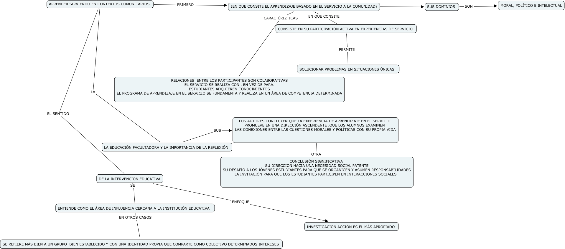 Este Cmap, tiene información relacionada con: CAPÍTULO 4, DE LA INTERVENCIÓN EDUCATIVA SE ENTIENDE COMO EL ÁREA DE INFLUENCIA CERCANA A LA INSTITUCIÓN EDUCATIVA, APRENDER SIRVIENDO EN CONTEXTOS COMUNITARIOS PRIMERO ¿EN QUE CONSITE EL APRENDIZAJE BASADO EN EL SERVICIO A LA COMUNIDAD?, APRENDER SIRVIENDO EN CONTEXTOS COMUNITARIOS LA LA EDUCACIÒN FACULTADORA Y LA IMPORTANCIA DE LA REFLEXIÓN, ¿EN QUE CONSITE EL APRENDIZAJE BASADO EN EL SERVICIO A LA COMUNIDAD? CARACTÈRIZTICAS RELACIONES ENTRE LOS PARTICIPANTES SON COLABORATIVAS EL SERVICIO SE REALIZA CON , EN VEZ DE PARA. ESTUDIANTES ADQUIEREN CONOCIMIENTOS EL PROGRAMA DE APRENDIZAJE EN EL SERVICIO SE FUNDAMENTA Y REALIZA EN UN ÀREA DE COMPETENCIA DETERMINADA, SUS DOMINIOS SON MORAL, POLÍTICO E INTELECTUAL, ENTIENDE COMO EL ÁREA DE INFLUENCIA CERCANA A LA INSTITUCIÓN EDUCATIVA EN OTROS CASOS SE REFIERE MÁS BIEN A UN GRUPO BIEN ESTABLECIDO Y CON UNA IDENTIDAD PROPIA QUE COMPARTE COMO COLECTIVO DETERMINADOS INTERESES, LOS AUTORES CONCLUYEN QUE LA EXPERIENCIA DE APRENDIZAJE EN EL SERVICIO PROMUEVE EN UNA DIRECCIÓN ASCENDENTE ,QUE LOS ALUMNOS EXAMINEN LAS CONEXIONES ENTRE LAS CUESTIONES MORALES Y POLÍTICAS CON SU PROPIA VIDA OTRA CONCLUSIÓN SIGNIFICATIVA SU DIRECCIÒN HACIA UNA NECESIDAD SOCIAL PATENTE SU DESAFÍO A LOS JÓVENES ESTUDIANTES PARA QUE SE ORGANICEN Y ASUMEN RESPONSABILIDADES LA INVITACIÓN PARA QUE LOS ESTUDIANTES PARTICIPEN EN INTERACCIONES SOCIALES, APRENDER SIRVIENDO EN CONTEXTOS COMUNITARIOS EL SENTIDO DE LA INTERVENCIÓN EDUCATIVA, ¿EN QUE CONSITE EL APRENDIZAJE BASADO EN EL SERVICIO A LA COMUNIDAD? EN QUE CONSITE CONSISTE EN SU PARTICIPACIÓN ACTIVA EN EXPERIENCIAS DE SERVICIO, DE LA INTERVENCIÓN EDUCATIVA ENFOQUE INVESTIGACIÒN ACCIÓN ES EL MÁS APROPIADO, CONSISTE EN SU PARTICIPACIÓN ACTIVA EN EXPERIENCIAS DE SERVICIO PERMITE SOLUCIONAR PROBLEMAS EN SITUACIONES ÙNICAS, LA EDUCACIÒN FACULTADORA Y LA IMPORTANCIA DE LA REFLEXIÓN SUS LOS AUTORES CONCLUYEN QUE LA EXPERIENCIA DE APRENDIZAJE EN EL SERVICIO PROMUEVE EN UNA DIRECCIÓN ASCENDENTE ,QUE LOS ALUMNOS EXAMINEN LAS CONEXIONES ENTRE LAS CUESTIONES MORALES Y POLÍTICAS CON SU PROPIA VIDA, ¿EN QUE CONSITE EL APRENDIZAJE BASADO EN EL SERVICIO A LA COMUNIDAD? ???? SUS DOMINIOS