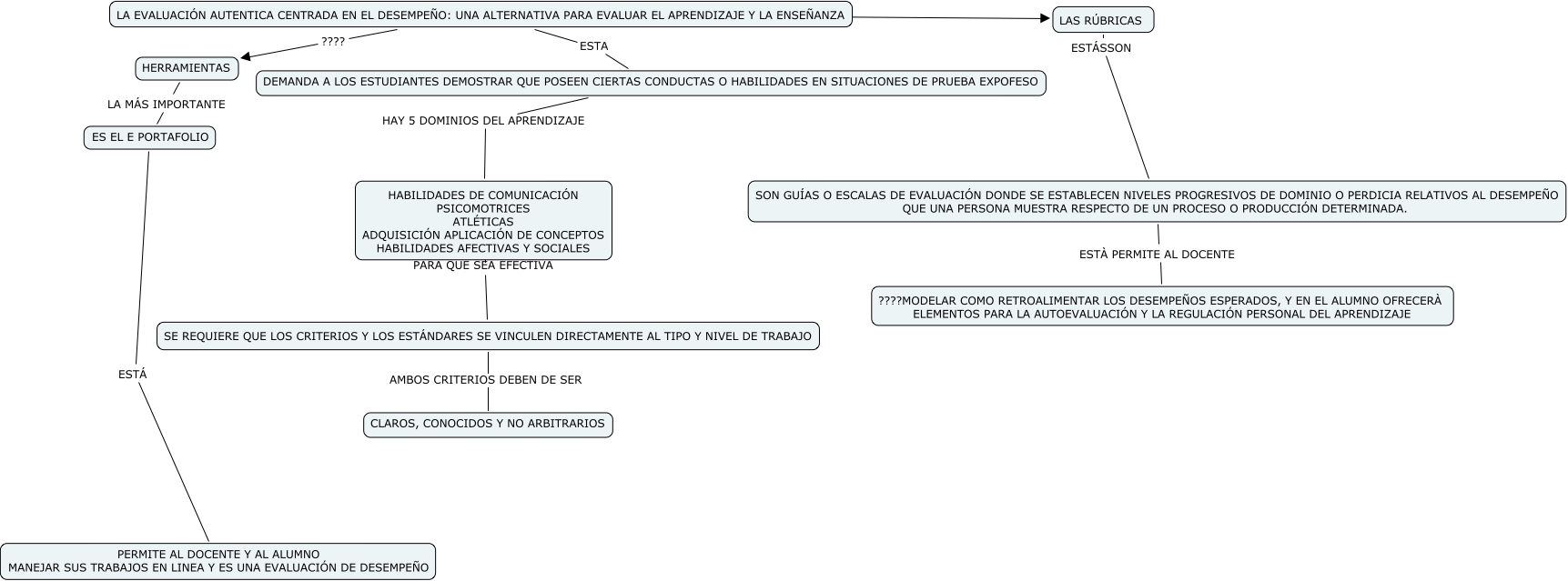 Este Cmap, tiene información relacionada con: CAPÍTULO 5, DEMANDA A LOS ESTUDIANTES DEMOSTRAR QUE POSEEN CIERTAS CONDUCTAS O HABILIDADES EN SITUACIONES DE PRUEBA EXPOFESO HAY 5 DOMINIOS DEL APRENDIZAJE HABILIDADES DE COMUNICACIÓN PSICOMOTRICES ATLÉTICAS ADQUISICIÓN APLICACIÓN DE CONCEPTOS HABILIDADES AFECTIVAS Y SOCIALES, SE REQUIERE QUE LOS CRITERIOS Y LOS ESTÁNDARES SE VINCULEN DIRECTAMENTE AL TIPO Y NIVEL DE TRABAJO AMBOS CRITERIOS DEBEN DE SER CLAROS, CONOCIDOS Y NO ARBITRARIOS, LA EVALUACIÓN AUTENTICA CENTRADA EN EL DESEMPEÑO: UNA ALTERNATIVA PARA EVALUAR EL APRENDIZAJE Y LA ENSEÑANZA ESTA DEMANDA A LOS ESTUDIANTES DEMOSTRAR QUE POSEEN CIERTAS CONDUCTAS O HABILIDADES EN SITUACIONES DE PRUEBA EXPOFESO, SON GUÍAS O ESCALAS DE EVALUACIÓN DONDE SE ESTABLECEN NIVELES PROGRESIVOS DE DOMINIO O PERDICIA RELATIVOS AL DESEMPEÑO QUE UNA PERSONA MUESTRA RESPECTO DE UN PROCESO O PRODUCCIÓN DETERMINADA. ESTÀ PERMITE AL DOCENTE ????MODELAR COMO RETROALIMENTAR LOS DESEMPEÑOS ESPERADOS, Y EN EL ALUMNO OFRECERÀ ELEMENTOS PARA LA AUTOEVALUACIÓN Y LA REGULACIÓN PERSONAL DEL APRENDIZAJE, LAS RÚBRICAS ESTÁSSON SON GUÍAS O ESCALAS DE EVALUACIÓN DONDE SE ESTABLECEN NIVELES PROGRESIVOS DE DOMINIO O PERDICIA RELATIVOS AL DESEMPEÑO QUE UNA PERSONA MUESTRA RESPECTO DE UN PROCESO O PRODUCCIÓN DETERMINADA., LA EVALUACIÓN AUTENTICA CENTRADA EN EL DESEMPEÑO: UNA ALTERNATIVA PARA EVALUAR EL APRENDIZAJE Y LA ENSEÑANZA ???? HERRAMIENTAS, HERRAMIENTAS LA MÁS IMPORTANTE ES EL E PORTAFOLIO, ES EL E PORTAFOLIO ESTÁ PERMITE AL DOCENTE Y AL ALUMNO MANEJAR SUS TRABAJOS EN LINEA Y ES UNA EVALUACIÓN DE DESEMPEÑO, LA EVALUACIÓN AUTENTICA CENTRADA EN EL DESEMPEÑO: UNA ALTERNATIVA PARA EVALUAR EL APRENDIZAJE Y LA ENSEÑANZA ???? LAS RÚBRICAS, HABILIDADES DE COMUNICACIÓN PSICOMOTRICES ATLÉTICAS ADQUISICIÓN APLICACIÓN DE CONCEPTOS HABILIDADES AFECTIVAS Y SOCIALES PARA QUE SEA EFECTIVA SE REQUIERE QUE LOS CRITERIOS Y LOS ESTÁNDARES SE VINCULEN DIRECTAMENTE AL TIPO Y NIVEL DE TRABAJO