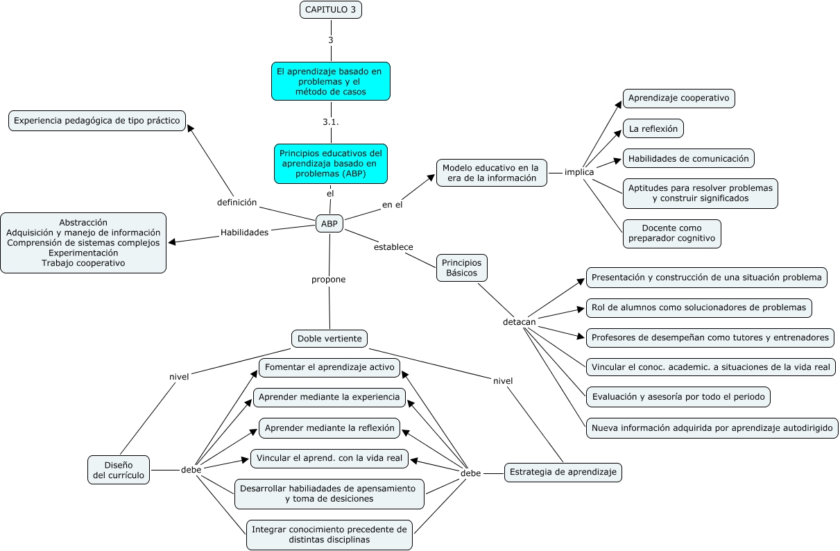 Este Cmap, tiene información relacionada con: 31, Estrategia de aprendizaje debe Integrar conocimiento precedente de distintas disciplinas, Doble vertiente nivel Diseño del currículo, Diseño del currículo debe Integrar conocimiento precedente de distintas disciplinas, Estrategia de aprendizaje debe Desarrollar habiliadades de apensamiento y toma de desiciones, CAPITULO 3 3 El aprendizaje basado en problemas y el método de casos, Diseño del currículo debe Fomentar el aprendizaje activo, ABP definición Experiencia pedagógica de tipo práctico, Principios Básicos detacan Nueva información adquirida por aprendizaje autodirigido, Modelo educativo en la era de la información implica Aprendizaje cooperativo, Diseño del currículo debe Desarrollar habiliadades de apensamiento y toma de desiciones, Estrategia de aprendizaje debe Aprender mediante la reflexión, Principios Básicos detacan Rol de alumnos como solucionadores de problemas, Principios Básicos detacan Vincular el conoc. academic. a situaciones de la vida real, El aprendizaje basado en problemas y el método de casos 3.1. Principios educativos del aprendizaja basado en problemas (ABP), ABP en el Modelo educativo en la era de la información, ABP propone Doble vertiente, ABP Habilidades Abstracción Adquisición y manejo de información Comprensión de sistemas complejos Experimentación Trabajo cooperativo, ABP establece Principios Básicos, Doble vertiente nivel Estrategia de aprendizaje, Principios Básicos detacan Evaluación y asesoría por todo el periodo
