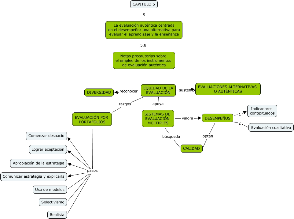 Este Cmap, tiene información relacionada con: 58, EVALUACIÓN POR PORTAFOLIOS pasos Comunicar estrategia y explicarla, EVALUACIÓN POR PORTAFOLIOS pasos Apropiación de la estrategia, SISTEMAS DE EVALUACIÓN MÚLTIPLES valora DESEMPEÑOS, EVALUACIÓN POR PORTAFOLIOS pasos Comenzar despacio, EVALUACIÓN POR PORTAFOLIOS pasos Realista, EQUIDAD DE LA EVALUACIÓN sustento EVALUACIONES ALTERNATIVAS O AUTÉNTICAS, EVALUACIÓN POR PORTAFOLIOS pasos Lograr aceptación, La evaluación auténtica centrada en el desempeño: una alternativa para evaluar el aprendizaje y la enseñanza 5.8. Notas precautorias sobre el empleo de los instrumentos de evaluación auténtica, EQUIDAD DE LA EVALUACIÓN razgos EVALUACIÓN POR PORTAFOLIOS, DESEMPEÑOS optan CALIDAD, EVALUACIÓN POR PORTAFOLIOS pasos Selectivismo, DESEMPEÑOS 2 Evaluación cualitativa, SISTEMAS DE EVALUACIÓN MÚLTIPLES búsqueda CALIDAD, CAPITULO 5 5 La evaluación auténtica centrada en el desempeño: una alternativa para evaluar el aprendizaje y la enseñanza, DESEMPEÑOS 1 Indicadores contextuados, EVALUACIÓN POR PORTAFOLIOS pasos Uso de modelos, EQUIDAD DE LA EVALUACIÓN reconocer DIVERSIDAD, EQUIDAD DE LA EVALUACIÓN apoya SISTEMAS DE EVALUACIÓN MÚLTIPLES