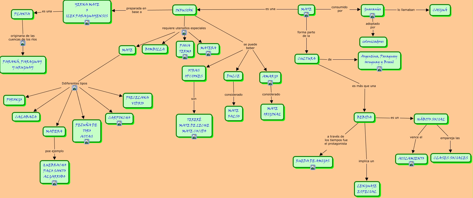 Este Cmap, tiene información relacionada con: MATE, PLANTA originaria de las cuencas de los ríos PARANÁ, PARAGUAY Y URUGUAY, BEBIDA es un HÁBITO SOCIAL, CULTURA es más que una BEBIDA, BEBIDA a través de los tiempos fue el protagonista RUEDA DE AMIGOS, OTRAS OPCIONES son TERERÉ MATE DE LECHE MATE COCIDO, MATE Ddiferentes tipos MADERA, MATE Ddiferentes tipos CALABAZA, INFUSIÓN se puede beber DULCE, AMARGO considerado MATE ORIGINAL, DULCE considerado MATE FALSO, INFUSIÓN requiere utensillos especiales PAVA TERMO, Guaraníes adoptado por colonizadores, MATE es una INFUSIÓN, INFUSIÓN requiere utensillos especiales BOMBILLA, INFUSIÓN requiere utensillos especiales MATE, MATE Ddiferentes tipos CARPINCHO, MATE Ddiferentes tipos PEZUÑA DE TORO ASTAS, YERNA MATE O ILEX PARAGUAYENSIS es una PLANTA, INFUSIÓN se puede beber OTRAS OPCIONES, INFUSIÓN requiere utensillos especiales MATERA