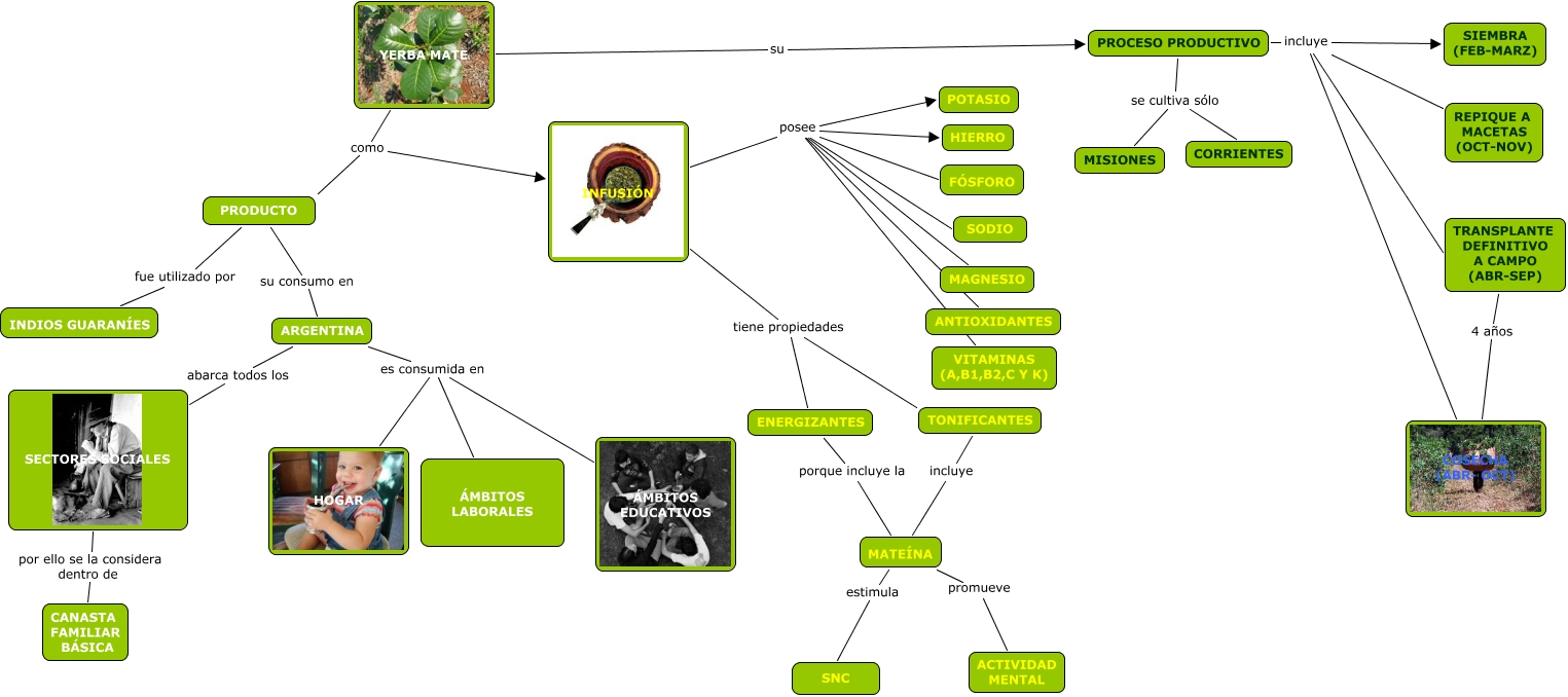 Este Cmap, tiene información relacionada con: CLASE 3 STELLA GAYOZO, MATEÍNA promueve ACTIVIDAD MENTAL, YERBA MATE como INFUSIÓN, PROCESO PRODUCTIVO incluye SIEMBRA (FEB-MARZ), PRODUCTO fue utilizado por INDIOS GUARANÍES, PROCESO PRODUCTIVO incluye COSECHA (ABR- OCT), YERBA MATE como PRODUCTO, MATEÍNA estimula SNC, ARGENTINA es consumida en ÁMBITOS LABORALES, INFUSIÓN posee FÓSFORO, INFUSIÓN posee POTASIO, PRODUCTO su consumo en ARGENTINA, PROCESO PRODUCTIVO se cultiva sólo MISIONES, SECTORES SOCIALES por ello se la considera dentro de CANASTA FAMILIAR BÁSICA, INFUSIÓN posee SODIO, PROCESO PRODUCTIVO se cultiva sólo CORRIENTES, ARGENTINA es consumida en ÁMBITOS EDUCATIVOS, ENERGIZANTES porque incluye la MATEÍNA, INFUSIÓN posee ANTIOXIDANTES, INFUSIÓN posee VITAMINAS (A,B1,B2,C Y K), TONIFICANTES incluye MATEÍNA