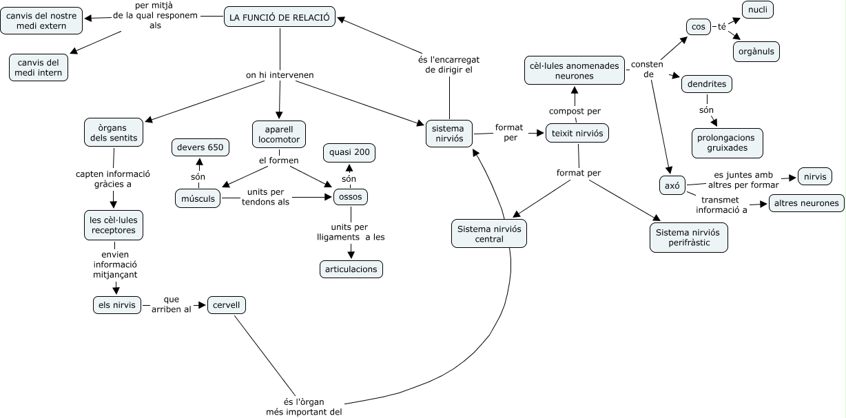 Este Cmap, tiene información relacionada con: La funció de nutrició, cèl·lules anomenades neurones consten de dendrites, teixit nirviós format per Sistema nirviós central, cèl·lules anomenades neurones consten de cos, LA FUNCIÓ DE RELACIÓ per mitjà de la qual responem als canvis del medi intern, LA FUNCIÓ DE RELACIÓ on hi intervenen sistema nirviós, sistema nirviós és l'encarregat de dirigir el LA FUNCIÓ DE RELACIÓ, axó es juntes amb altres per formar nirvis, LA FUNCIÓ DE RELACIÓ on hi intervenen aparell locomotor, cervell és l'òrgan més important del sistema nirviós, dendrites són prolongacions gruixades, cèl·lules anomenades neurones consten de axó, ossos són quasi 200, axó transmet informació a altres neurones, teixit nirviós compost per cèl·lules anomenades neurones, aparell locomotor el formen ossos, LA FUNCIÓ DE RELACIÓ per mitjà de la qual responem als canvis del nostre medi extern, teixit nirviós format per Sistema nirviós perifràstic, els nirvis que arriben al cervell, sistema nirviós format per teixit nirviós, les cèl·lules receptores envien informació mitjançant els nirvis